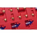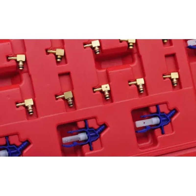 Prezentowany zestaw pozwoli ustalić ilość zwracanego z wtrysku paliwa, dzięki temu dowiesz się czy system działa poprawnie. Pozwoli zmierzyć ciśnienie pracy wszystkich 6 wtrysków na raz. W zestawie znajdą się 24 adaptery do wtrysków BOSCH-01, SIEMENS-02, DENSO-03 i DELPHI. Dodatkową zaletą będzie hak do zawieszania. Całość umieszczono w wygodnym i praktycznym futerale.