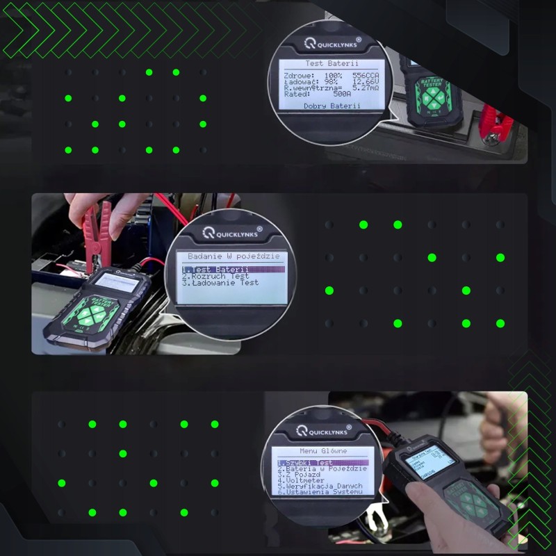 - SZYBKI TEST - sprawdzanie stanu baterii, poziomu naładowania, napięcia, rezystancji wewnętrznej, prądu rozruchowego