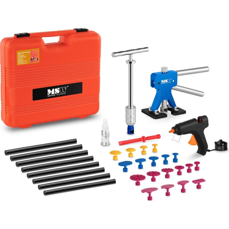 Model MSW-DENTPULLER.SET2, przez wzgląd na obszerność zestawu (33 elementów), umożliwia wyciąganie wgnieceń o różnych wielkościach oraz kształtach. W zakresie dostawy znajduje się wydajny pistolet do klejenia o mocy 40 W (i 8 szt. kleju o dużej przyczepności), młot bezwładnościowy do większych wgnieceń, urządzenia do wyciągania małych i wiele innych akcesoriów specjalistycznych.
