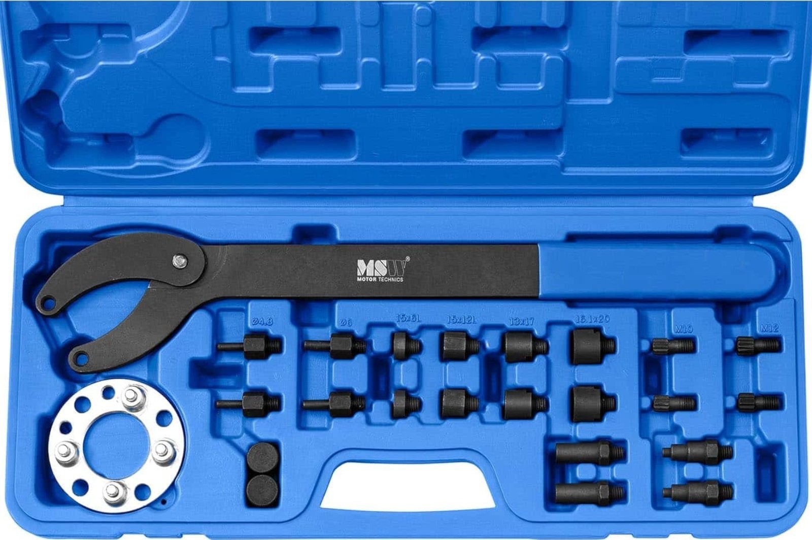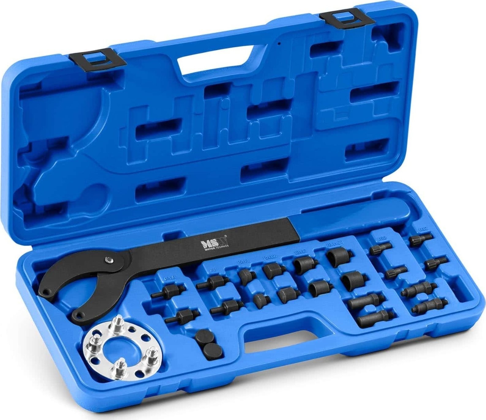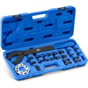 Blokada rozrządu marki MSW nadaje się do różnych modeli samochodów marek Audi, Seat, VW i Skoda oraz innych z silnikami dysponującymi wytryskiem typu common rail (1.2, 1.4, 1.6, 2.0 TDI CR). Profesjonalne narzędzie umożliwia wymianę wałka rozrządu, paska zębatego, pompy oleju lub tłumika drgań. Skutecznie zablokuje też wał korbowy. Sprzęt sprawdzi się zarówno w specjalistycznych warsztatach, jak i prywatnych garażach. Wymiana wałka rozrządu, paska lub pompy oleju bez uszkodzenia części wymaga specjalnego narzędzia. Zestaw marki MSW to rozwiązanie dla szerokiej gamy modeli pojazdów. 22-częściowy zestaw zawiera wszystko, co niezbędne do delikatnej wymiany części. Narzędzia zostały wykonane z wytrzymałego materiału, dzięki temu będą służyć przez długi czas. Blokada rozrządu znajduje się w walizce z tworzywa sztucznego, która posiada uformowane wgłębienia na każdy element. Praktyczny uchwyt ułatwia wygodny transport kompletu.