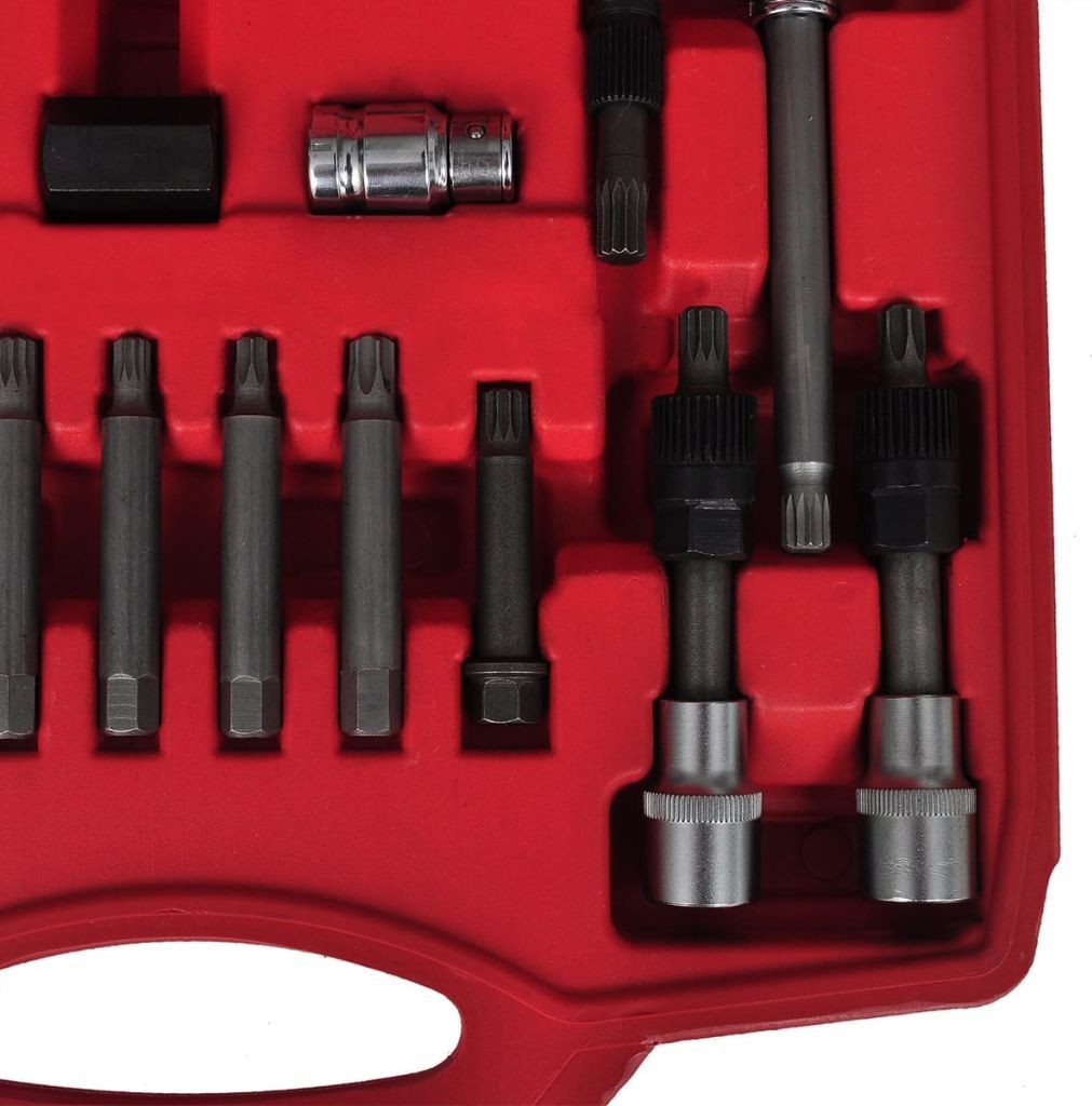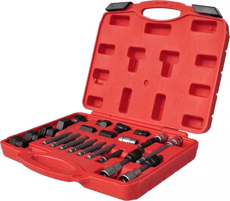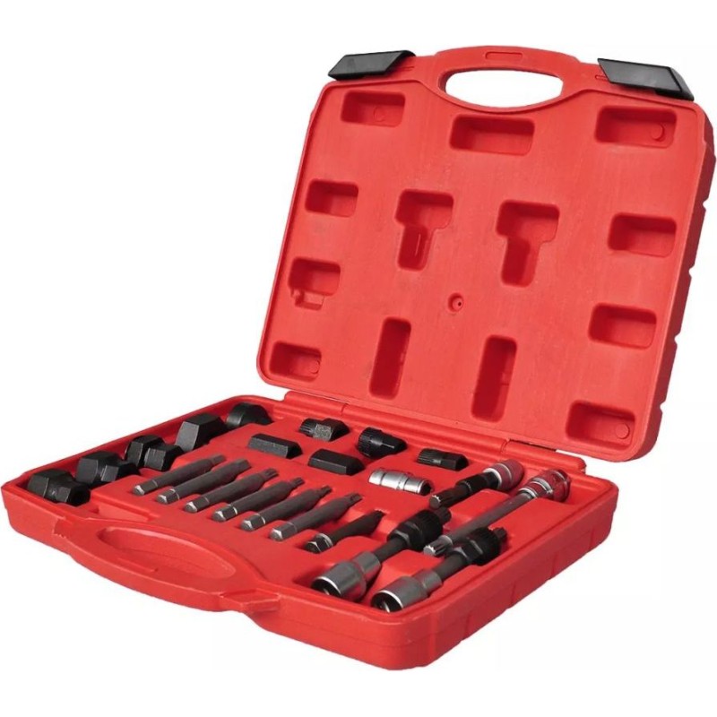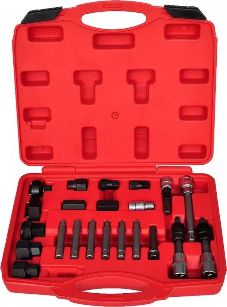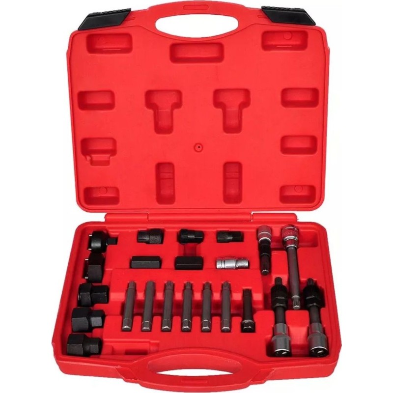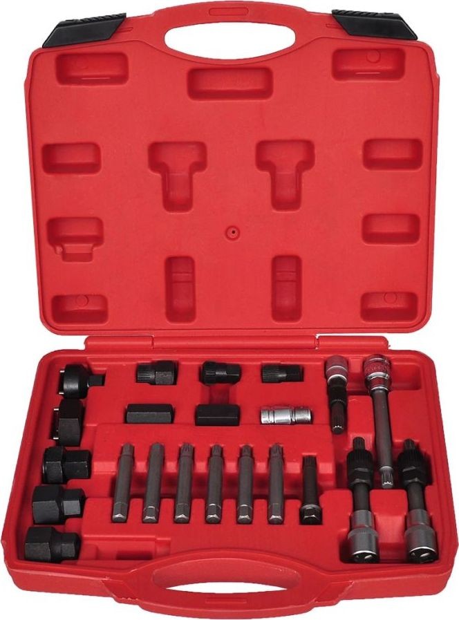 Zestaw do usuwania koła alternatora zawiera 22 profesjonalne klucze i nasadki. Umożliwia on łatwe zdjęcie koła pasowego alternatora. Pozwala on także na przytrzymanie trzpienia alternatora przy jednoczesnym zdejmowaniu uchwytu koła pasowego.