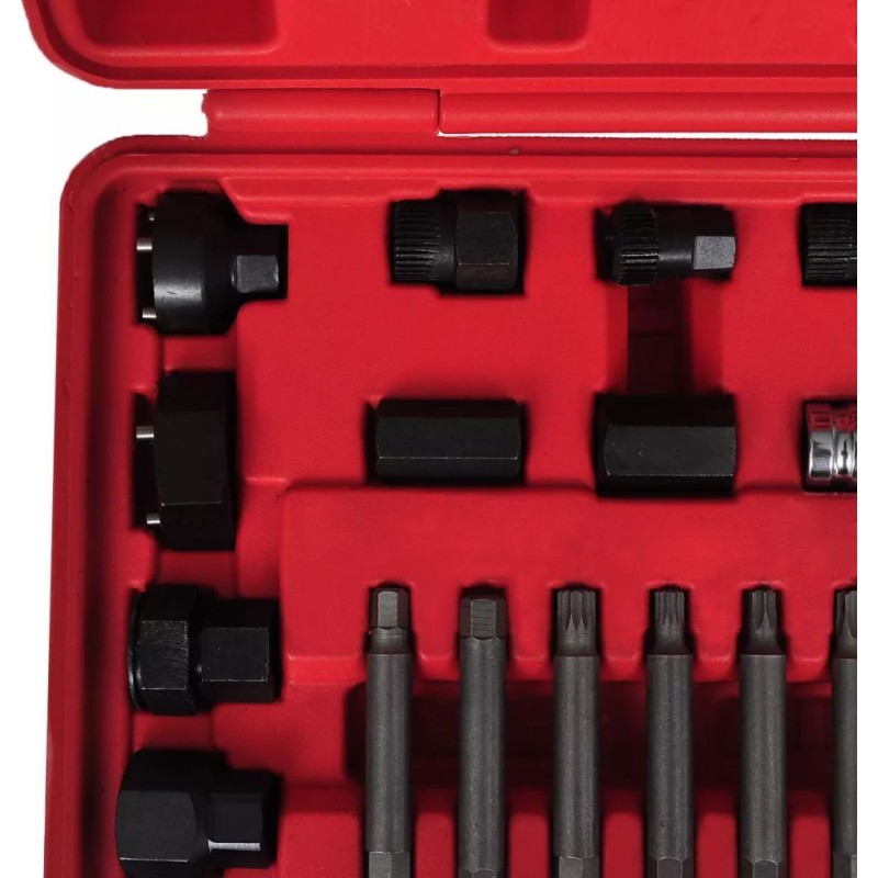 Ten zestaw do naprawy i zdejmowania koła alternatora zawiera różne adaptery, pasujące do wszystkich większych marek, w tym pełen zakres adapterów TRX, spline i sześciokątnych, aby pasować do większości alternatorów.