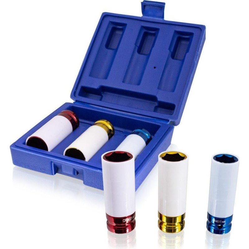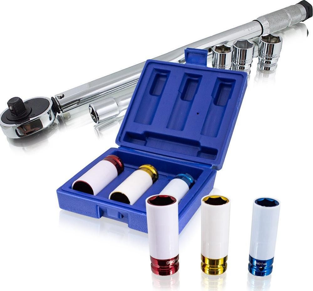 Do zestawu dołączone są dodatkowe nakrętki 17, 19, 21mm z ochronnym rantem, które są idealne do zmiany kół bez uszkadzania felg.