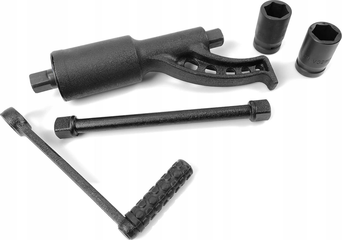 Trzpień 1" jest kompatybilny z wszystkimi nasadkami 1" stosowanymi w innych narzędziach. Wystarczy nałożyć jedną z dwóch dostępnych nasadek 32mm lub 33mm, poluzować śrubę kluczem, następnie użyć dołączonej przedłużki, aby błyskawicznie odkręcić każdą śrubę.