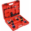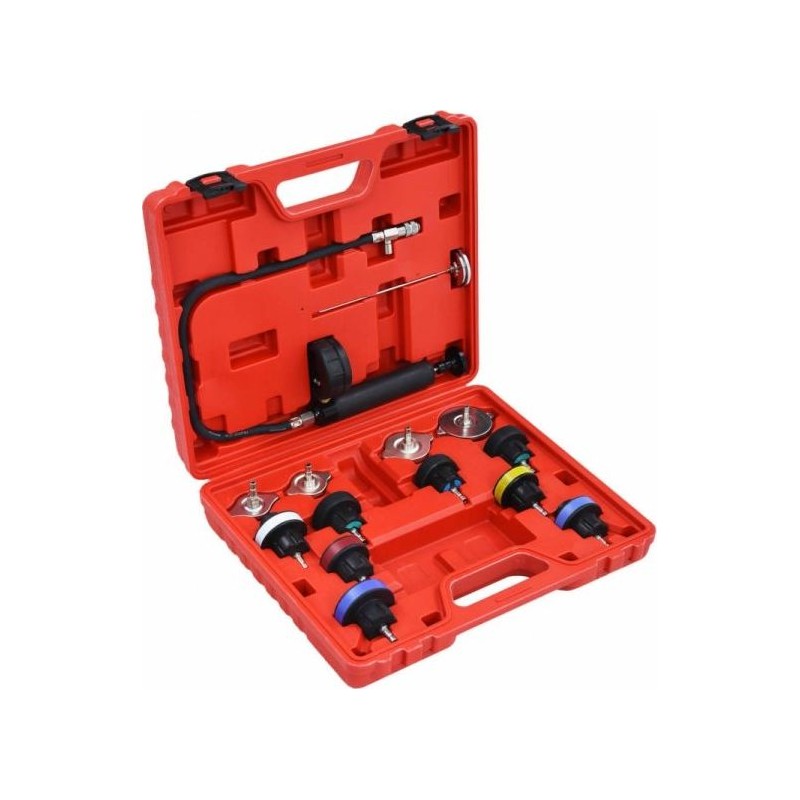 Ten wysokiej jakości tester ciśnienia i temperatury systemu chłodzenia składa się z 14 elementów i będzie idealnym narzędziem do warsztatów miłośników samochodów i profesjonalnych mechaników. Jest on przeznaczony do pojazdów następujących marek: VW, Audi, Volvo, Saab, Mercedes-Benz, BMW, Renault, Porsche, Jaguar, Mitsubishi, Mazda, Toyota, Honda, Suzuki, Isuzu, Ford, GM, Chrysler, Fiat, Alfa Romeo, Lexus, Peugeot, Jeep, Land Rover itp.