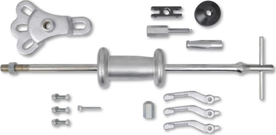 - Zawartość zestawu: młotek bezwładnościowy 5 lb, 2- i 3-szczękowy ściągacz wewnętrzny i zewnętrzny, haczyk, ściągacz do tylnej osi, element do usuwania wgnieceń oraz adapter klucza.