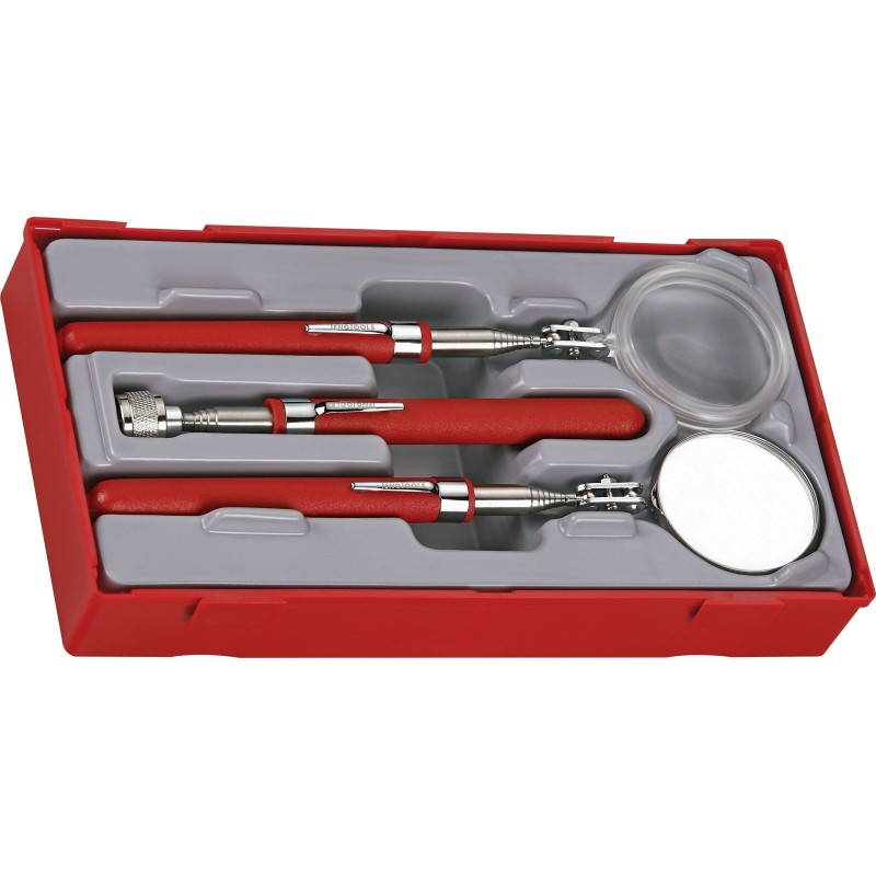 Zawiera trzy narzędzia o budowie teleskopowej: lusterko inspekcyjne, szkło powiększające i magnes. Wszystkie z zaczepem do kieszeni. Dostarczany w pojemniku tworzywowym z odłączaną pokrywą. Pasuje do skrzynek i wózków narzędziowych Teng Tools.