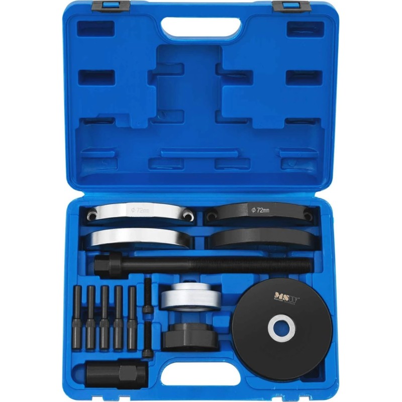 Ściągacz do łożysk piasty przedniej MSW-SPS-19 marki MSW to zestaw narzędzi do bezpiecznego montażu i demontażu zespołu łożyskowego piasty przedniego koła. Świetnie nadaje się do profesjonalnego użytku w warsztatach mechanicznych i serwisach pojazdów. Komplet pasuje do: Audi A2, Skoda Fabia 00-, VW Polo, VW Fox 05- i Seat Ibiza 02-. Wykonanie ze stali z antykorozyjnym pokryciem zapewnia narzędziom długą trwałość. Całość znajduje się w wygodnej walizce.