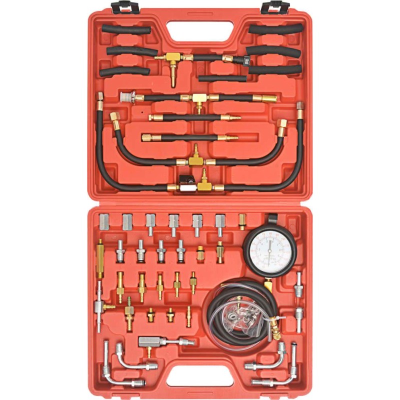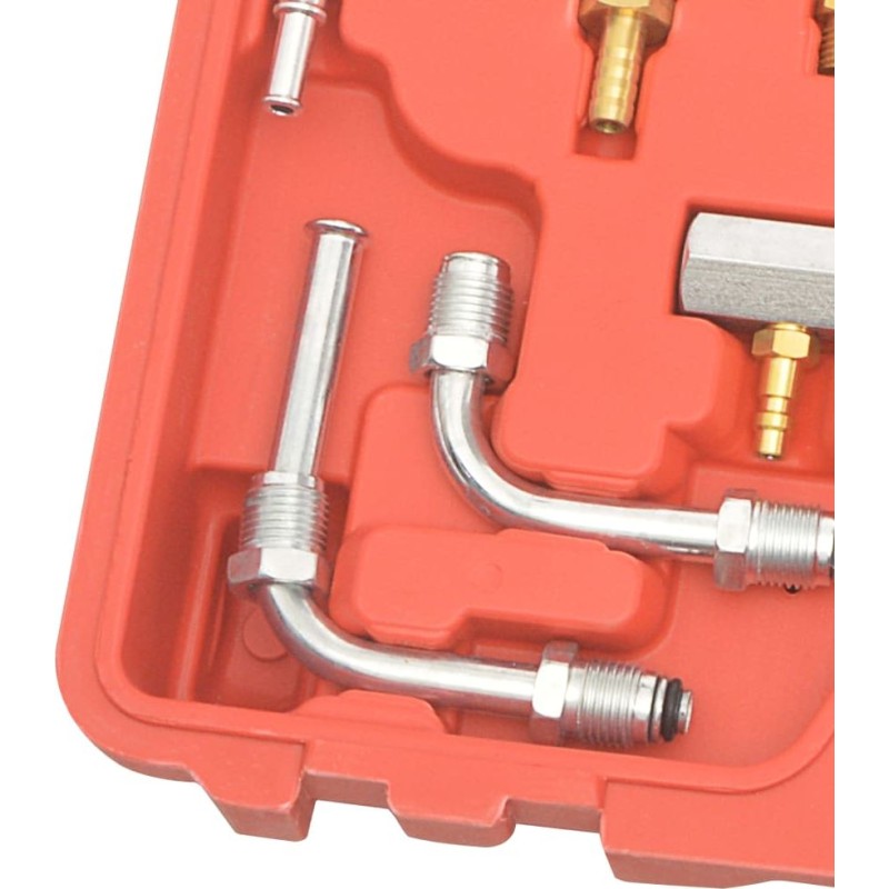 Ten profesjonalny miernik ciśnienia paliwa układu wtryskowego zawiera adaptery, węże, zaciski i złączki, które będą odpowiednie do zastosowania przy mechanicznych i elektronicznych systemach wtrysku benzyny, w większości samochodów i ciężarówek, takich jak BMW, GM, Ford, Toyota, Nissan i inne pojazdy z silnikami benzynowymi.