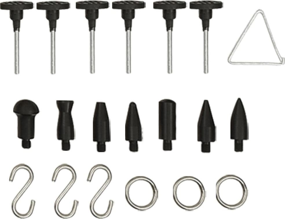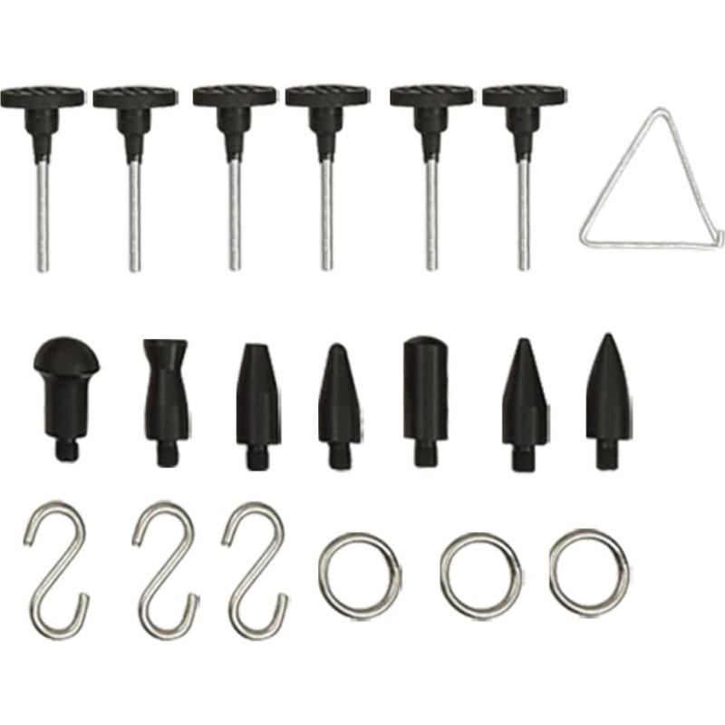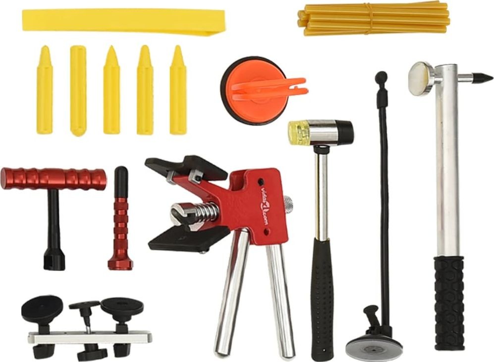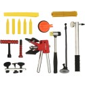Zestaw do naprawy samochodu zawiera grzybki w wielu różnych rozmiarach, przeznaczone do większości wgnieceń oraz uszkodzeń przez grad. Młotek bezwładnościowy ze stali nierdzewnej oferuje większą siłę do usuwania wgnieceń i poradzi sobie z większymi. Nowocześniejszy puller i odciąg sprawdzą się w przypadku małych i średnich wgnieceń. Proces usuwania wgnieceń, polegający na ich skutecznym i bezpiecznym wyciąganiu, chroni lakier samochodowy. Płytka refleksyjna LED służy do sprawdzania wgnieceń na płaskich, metalowych powierzchniach. Samodzielne usuwanie wgnieceń bez lakierowania to najtańsza metoda naprawy karoserii, zagłębień po gradzie, wgnieceń w baku motocykla itp.