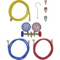 Kompletny zestaw narzędzi do sprzętu chłodniczego obejmuje pompę próżniową i 2-kierunkowy rozdzielacz na 2 manometry.
