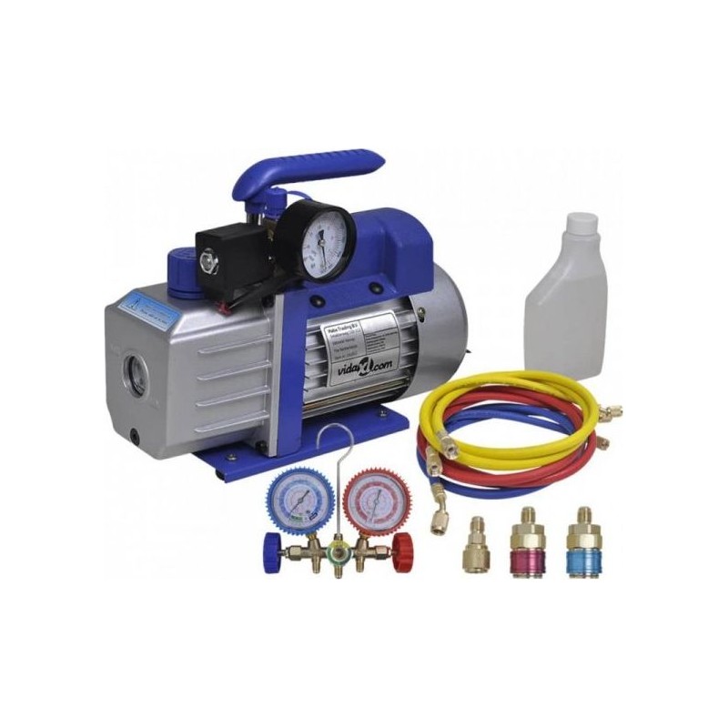 Kompletny zestaw narzędzi do sprzętu chłodniczego obejmuje pompę próżniową z miernikiem i 2-kierunkowy rozdzielacz.
