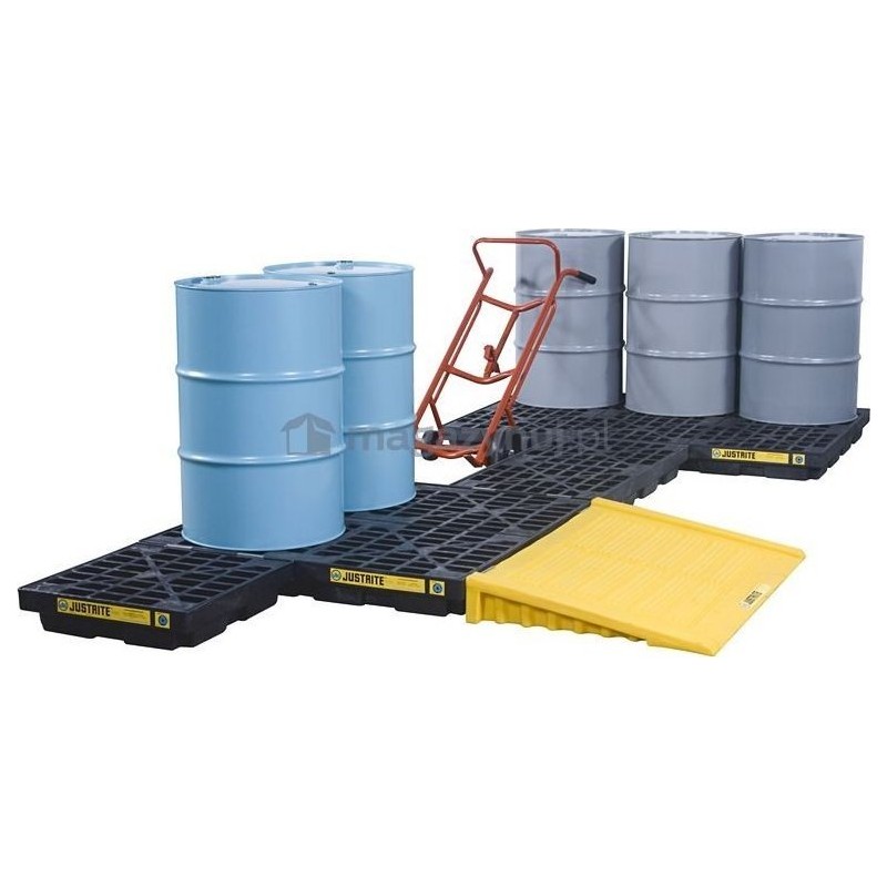 Opcjonalna rampa podjazdowa, mocowana do modułu za pomocą zaczepów, o małym kącie nachylenia, ułatwia ustawianie i zdejmowanie ciężkich beczek przy pomocy wózków. Antypoślizgowe żebrowanie rampy oraz platformy roboczej zapewnia bezpieczną eksploatację beczek i pojemników. Czarny kolor ukrywa zabrudzenia i sprawia, że środowisko pracy wygląda schludnie. Mocna, samoustawiająca się kratownica o grubości 64 mm, jest nieprzesuwna i łatwo zdejmuje się do czyszczenia. Posiada „zielony” certyfikat wydany przez UL Environment.