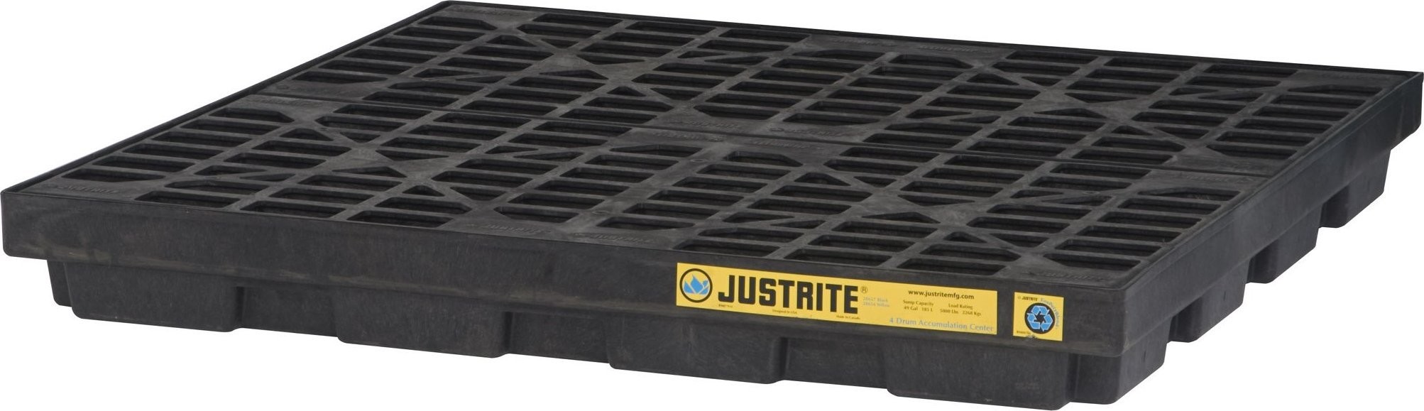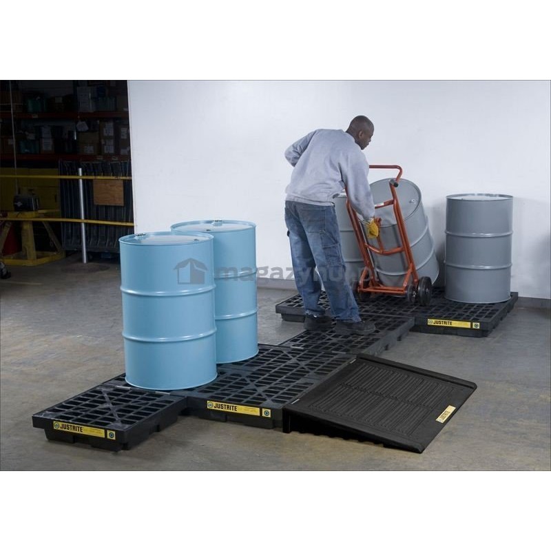 Opcjonalna rampa podjazdowa, mocowana do modułu za pomocą zaczepów, o małym kącie nachylenia, ułatwia ustawianie i zdejmowanie ciężkich beczek przy pomocy wózków. Antypoślizgowe żebrowanie rampy oraz platformy roboczej zapewnia bezpieczną eksploatację beczek i pojemników. Czarny kolor ukrywa zabrudzenia i sprawia, że środowisko pracy wygląda schludnie. Mocna, samoustawiająca się kratownica o grubości 64 mm, jest nieprzesuwna i łatwo zdejmuje się do czyszczenia. Posiada „zielony” certyfikat wydany przez UL Environment.
