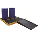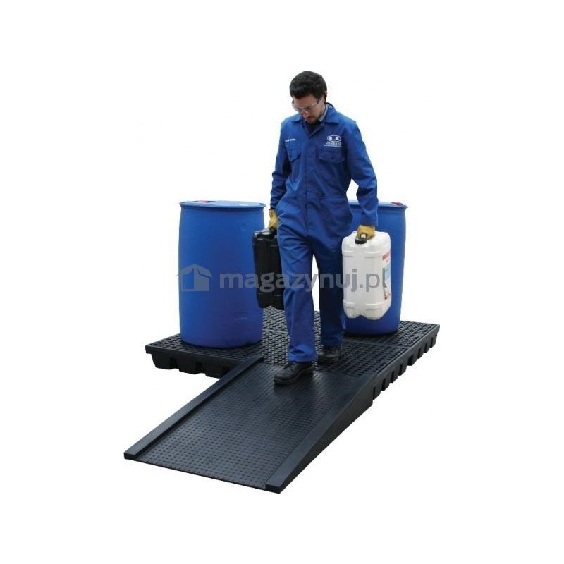 Opcjonalna rampa podjazdowa, mocowana do modułu za pomocą zaczepów, o małym kącie nachylenia, ułatwia ustawianie i zdejmowanie ciężkich beczek przy pomocy wózków. Antypoślizgowe żebrowanie rampy oraz platformy roboczej zapewnia bezpieczną eksploatację beczek i pojemników.