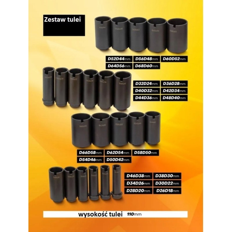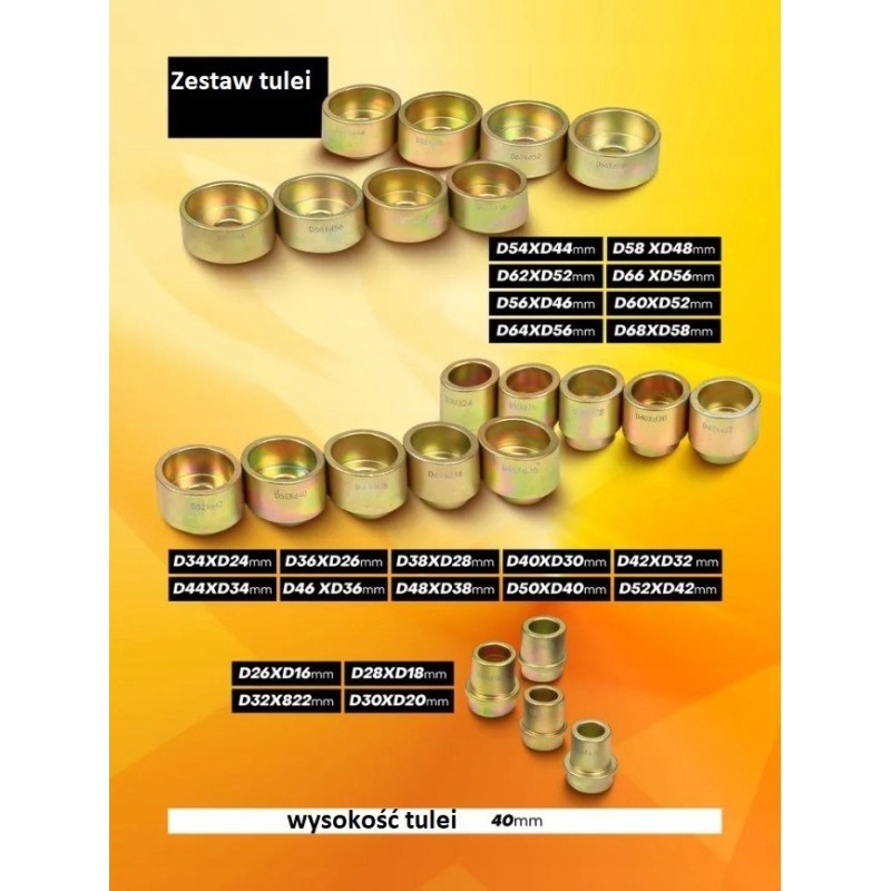 - Zestaw tulei o wysokości 40 i 110 mm, wystarczający do pracy z prawie każdym samochodem.