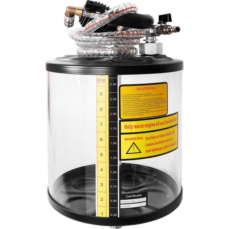Mobilna zlewarko-wysysarka do oleju, pneumatyczna ze zbiornikiem kontrolnym, ciśnienie opróżniania zbiornika 1 - 3 bar, ciśnienie robocze 6 - 8 bar, pojemność zbiornika 70 l, pojemność miski zlewowej 10 l, miska zlewowa stalowa, grubość 1,5 mm, waga 2,5 kg, średnica 42 cm, zbiornik rewizyjny z podziałką 10 l, masa całkowita 25 kg, robocza temperatura oleju 40 - 60 stopni C, 4 kółka, w tym 2 skrętne, regulacja wysokości miski.