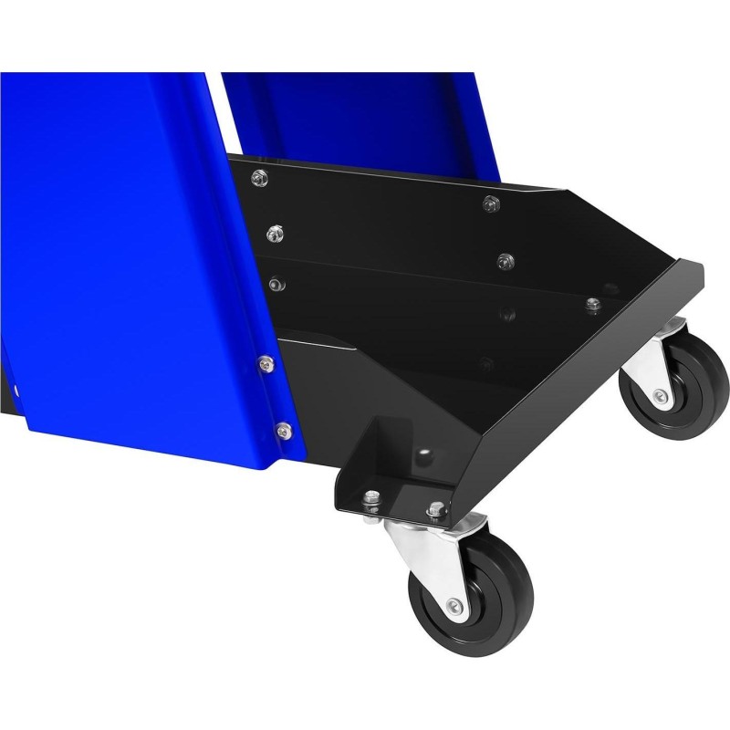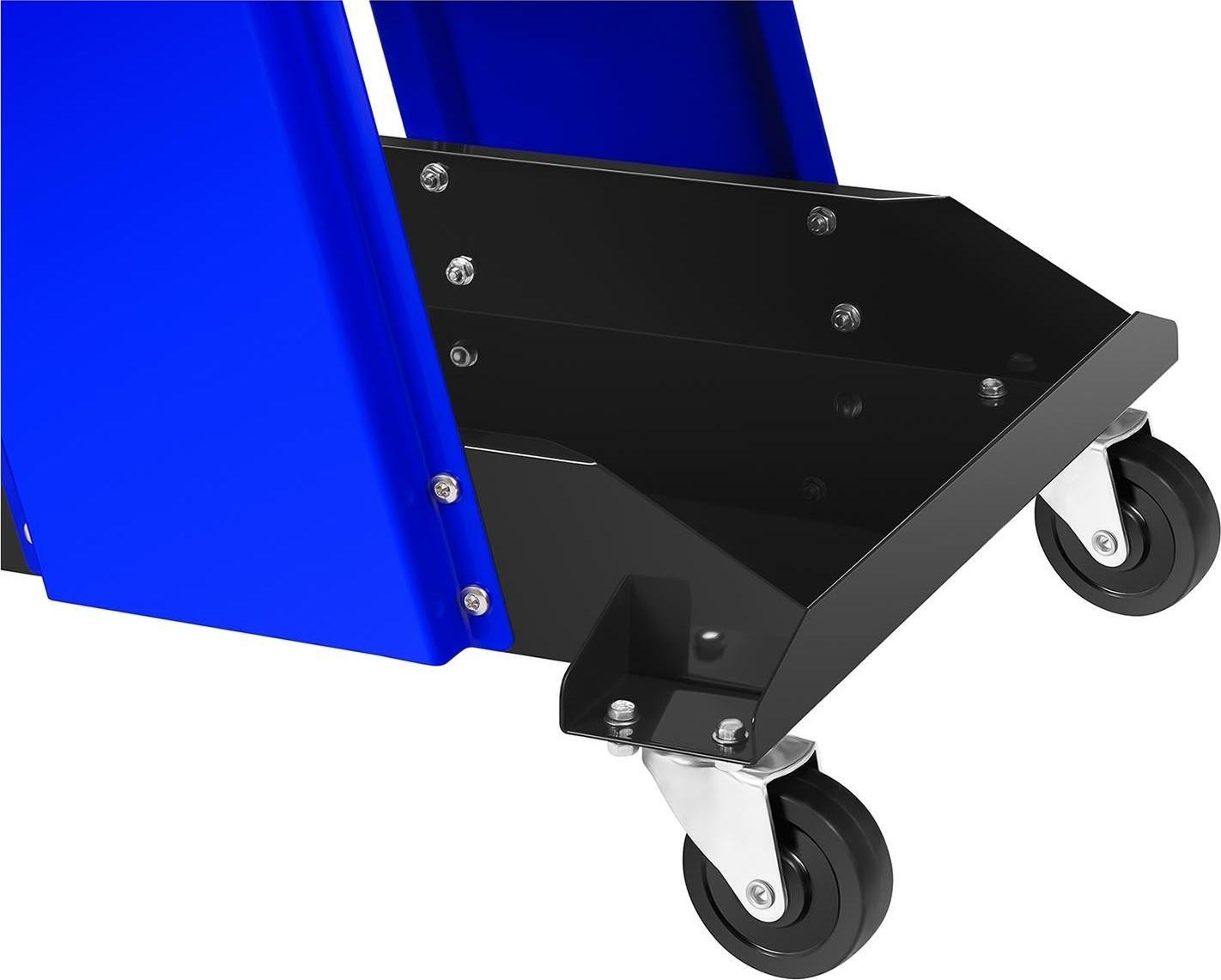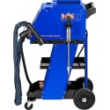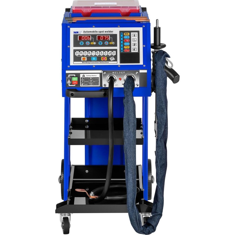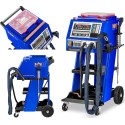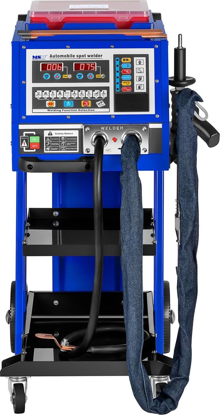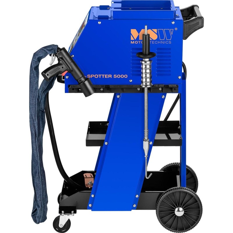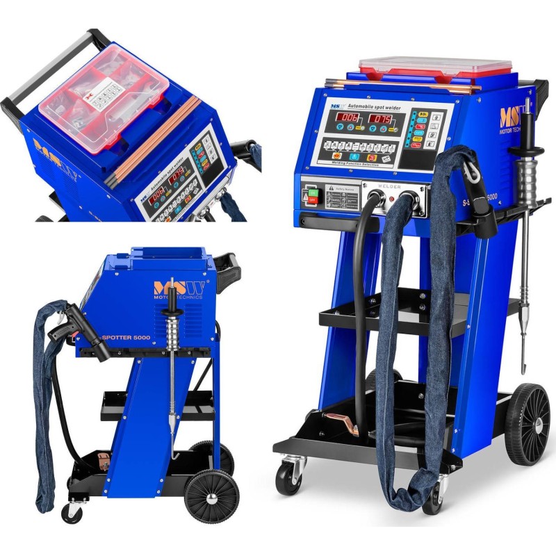 Zgrzewarka jest w pełni mobilna za sprawą czterech kółek (dwa skrętne i dwa stałe), a na praktyczne półki można położyć narzędzia i akcesoria. Do urządzenia dołączono praktyczny zestaw podkładek oraz narzędzi do wyciągania wgnieceń.