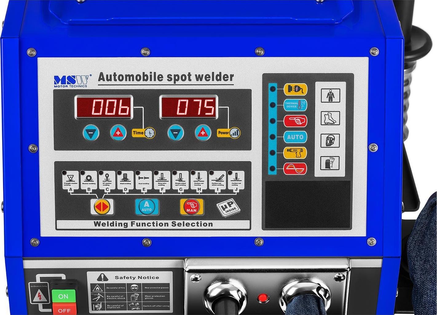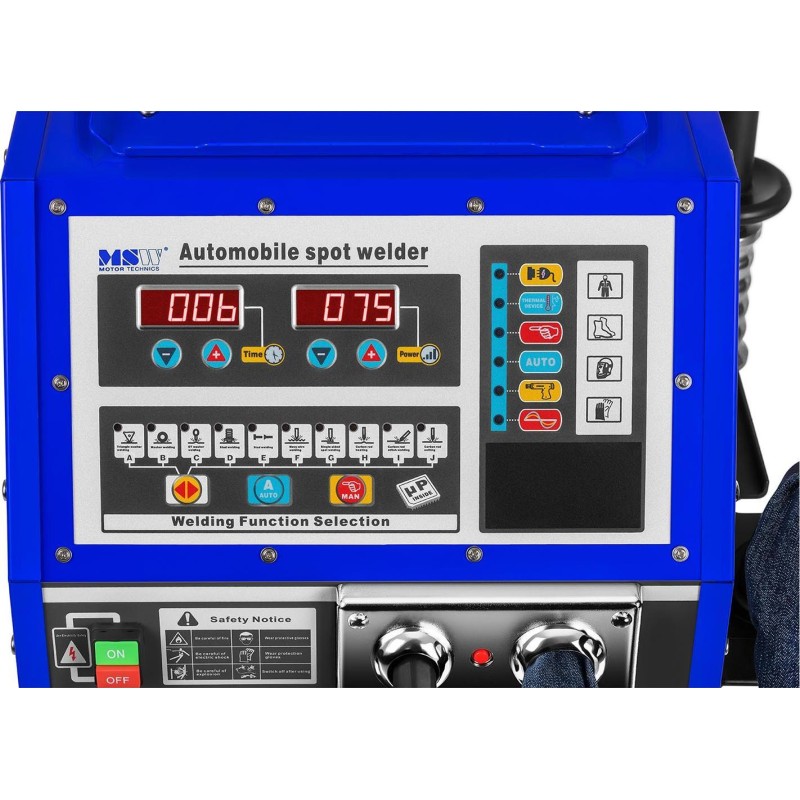 Urządzenie posiada też dwa tryby pracy (automatyczny i manualny). Pierwszy z nich pozwala na pracę według wcześniej ustalonego czasu zgrzewania, a drugi do momentu, aż zostanie zwolniony przycisk pistoletu. Bezpieczne korzystanie gwarantuje wbudowany bezpiecznik oraz system zapobiegający przegrzaniu. Kontrola nad stanem zgrzewarki jest możliwa dzięki czytelnemu wyświetlaczowi LED.