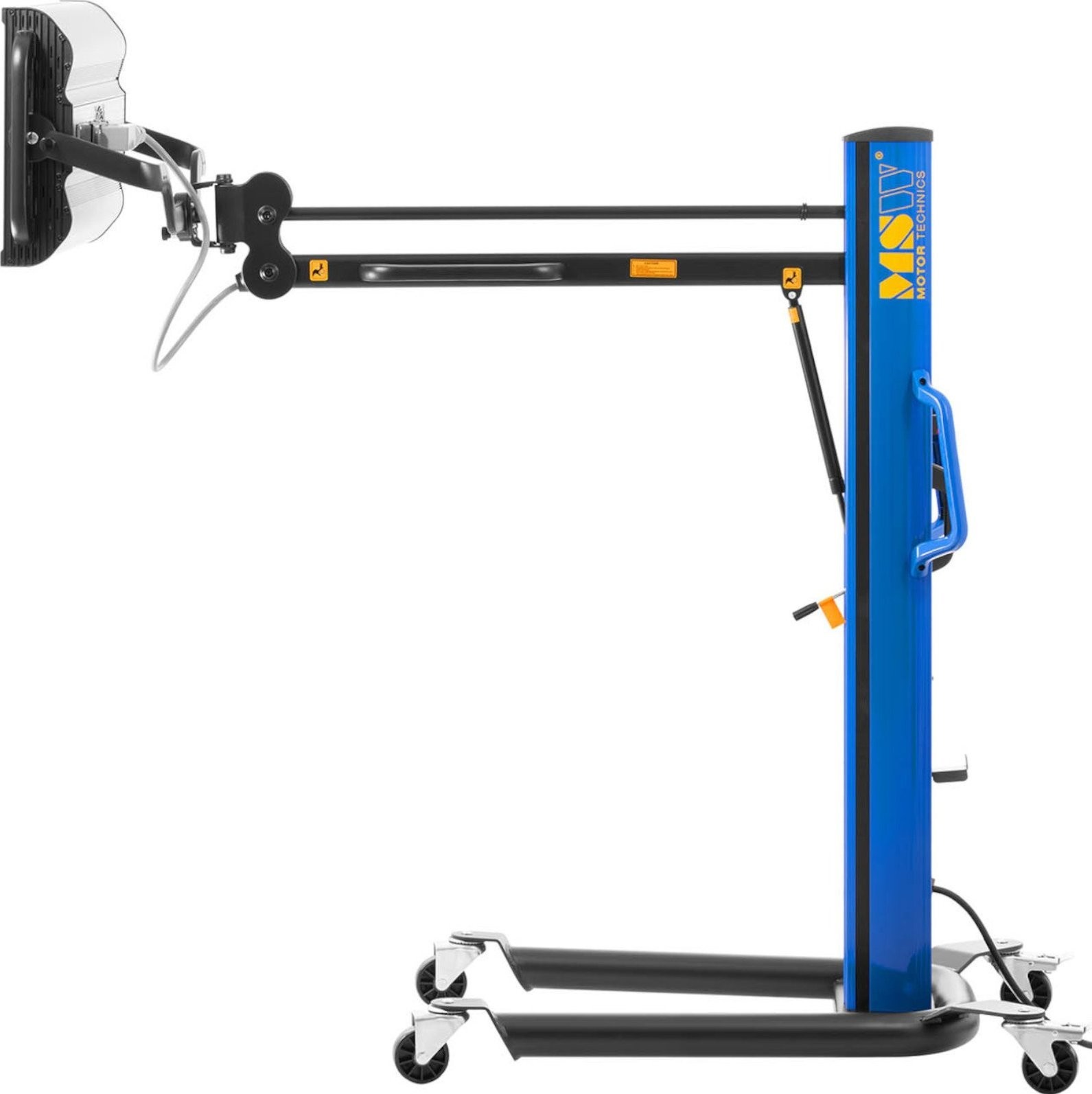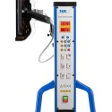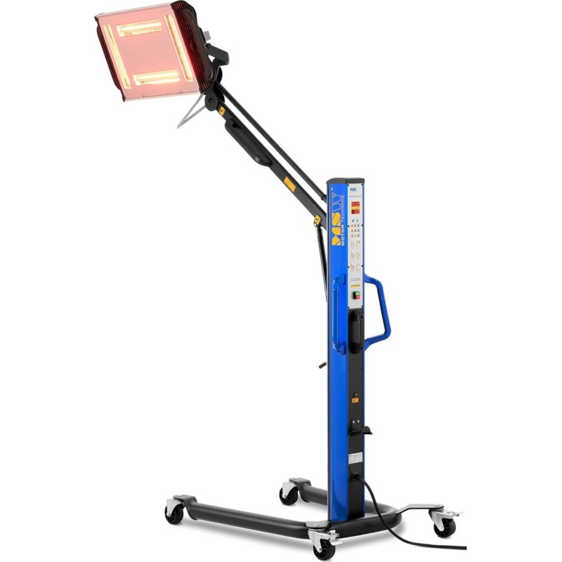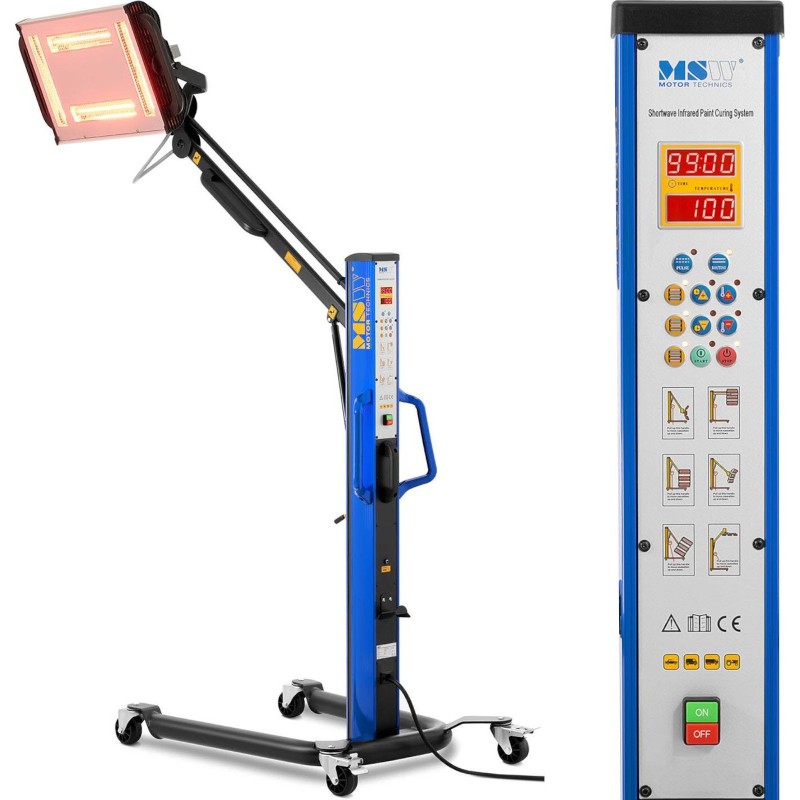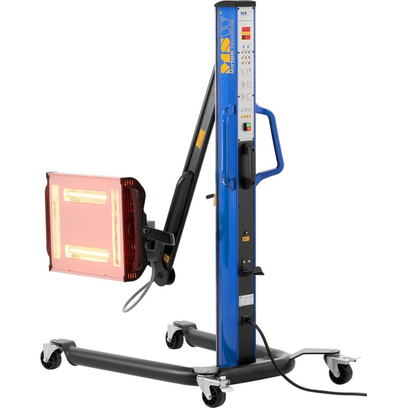 Promiennik podczerwieni marki MSW sprawdzi się w warsztatach samochodowych, lakierniach i wszędzie tam, gdzie potrzebne jest szybkie wysychanie farb, lakierów, żywic czy różnego typu wypełniaczy. Lampa posiada moc 4 x 1000 W. Urządzenie suszy farby i lakiery skuteczniej niż konwencjonalne sprzęty, ponieważ promieniowanie wnika do wnętrza i pozbawia je wilgoci od środka. Zapobiega tym samym tworzeniu się pęcherzy oraz przyspiesza proces. Promienie podczerwone nie wydzielają ciepła do otaczającego powietrza a przenoszą je bezpośrednio na powierzchnię roboczą. Hydrauliczne ramię przesuwa się w pionie i poziomie na wysokość do maks. 240 cm. Emitery można włączać i wyłączać indywidualnie. Kąt padania promieni można regulować w zależności od wymagań obrabianego przedmiotu. Obszar jednocześnie naświetlamy ma wymiary 1200 x 1000 mm. Za pomocą wyświetlacza LCD można ustawiać i monitorować czas suszenia w zakresie 0 - 99 min, można też wybrać lampy, które mają być użyte do suszenia. Temperatura zależna jest od odległości do obrabianego przedmiotu i może się wahać w zakresie 40 - 100C. Metalowa kratka chroni przed uszkodzeniem oraz oparzeniem. Konstrukcja lampy wykonana została z wytrzymałej stali, koła z hamulcami zapewniają mobilność i stabilizację.