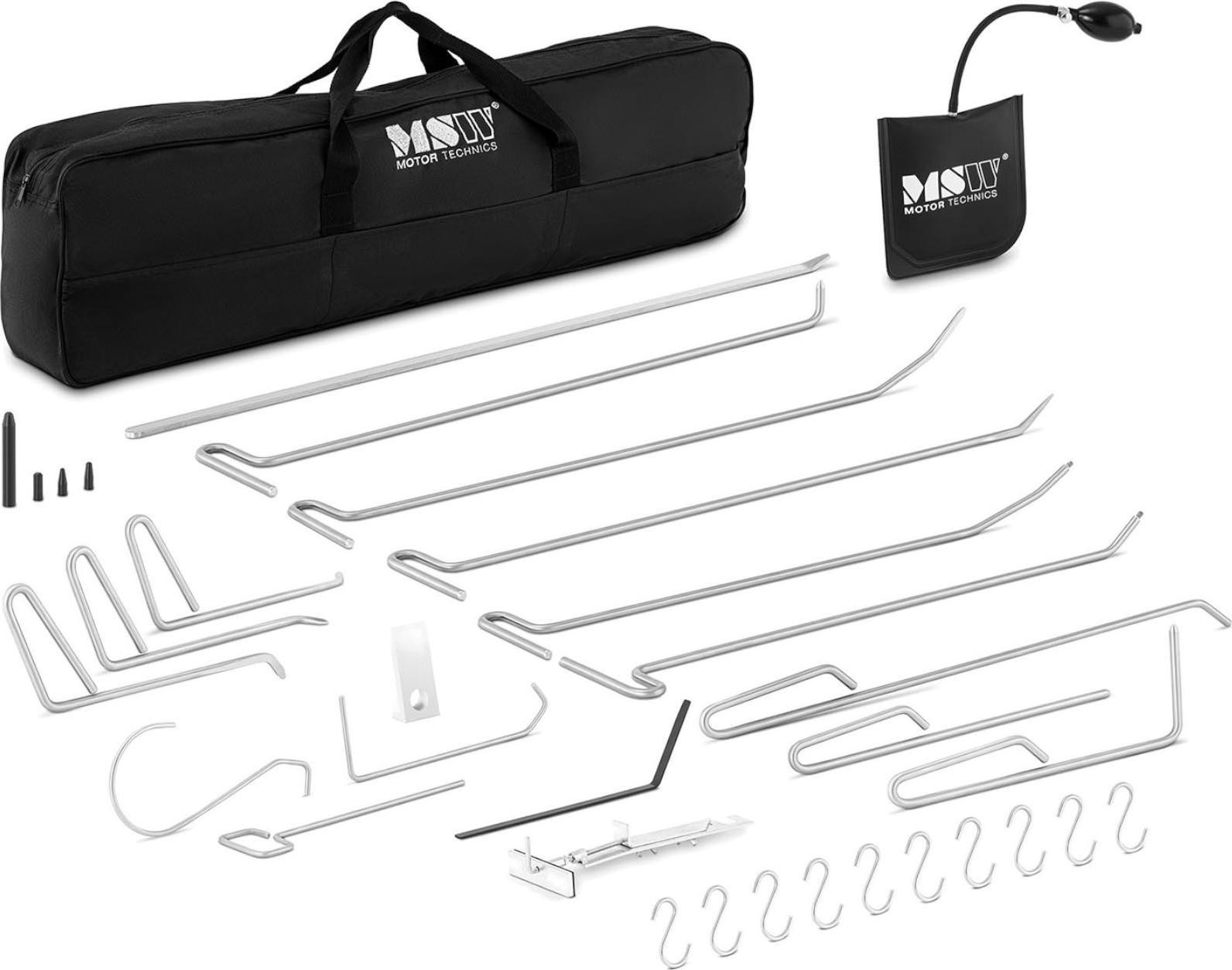 Zestaw do usuwania wgnieceń marki MSW sprawdzi się do niwelowania niewielkich wgnieceń w karoserii samochodowej, błotnikach motocykli, w obudowach sprzętów AGD oraz innych przedmiotów z blach. Zestaw składa się z uchwytu w kształcie litery T, klinów oraz zestawu haków w różnych rozmiarach. W komplecie znajdują się dwie torby do przenoszenia sprzętu.