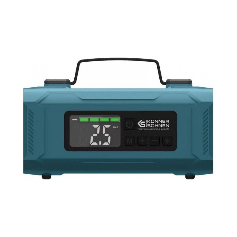 DANE TECHNICZNE: Typ akumulatora Litowo-jonowy Bateria, mAh 14800 Napięcie, V 15 Maks. ciśnienie pneumatyczne, psi 140 Szybkość napełniania, l/min 22 Maksymalna objętość powietrza, l/min 360 Czas pracy ciągłej, min 8 Dostępne jednostki miary PSI, BAR Wyjście USB 5V/2A Lampa LED + Znamionowy prąd rozruchowy, A 800 Szczytowy prąd rozruchowy, A 2000 Czas ładowania urządzenia, godzin 6 Temperatura pracy, °C -4 °C ... +50 °C Wymiary netto (DxSxW), mm 205×77×114 Wymiary brutto (DxSxW), mm 245x134x168 Waga brutto, kg 1.6 SZYBKI ROZRUCH SAMOCHODU Nowoczesny, wysokiej jakości akumulator litowo-jonowy 14800 mAh z wysokim prądem rozładowania nadaje się do silników benzynowych do 8 litrów i diesla do 5 litrów. Urządzenie ma natychmiastowe dostarczanie szczytowego prądu do 2000 A, więc w kilka sekund możesz uruchomić silnik swojego samochodu. WYSOKOCIŚNIENIOWY POWIETRZNY KOMPRESOR AKUMULATOROWY Wysokociśnieniowy powietrzny kompresor akumulatorowy 140 PSI ma prędkość pompowania 22 l/min, pozwala szybko pompować i opróżniać sprzęt bez konieczności podłączenia do źródła zasilania. Może być również używany jako manometr do pomiaru ciśnienia w oponach. CYFROWY WYŚWIETLACZ Wyświetlacz ułatwia obsługę urządzenia, pozwala w każdej chwili sprawdzić parametry pompowania w wybranych jednostkach miary (PSI, bar), obsługuje zatrzymywanie wcześniej ustawionych wartości, a także wyświetla informacje o poziomie naładowania baterii. WIELOFUNKCYJNA LATARKA LED Wbudowana jasna latarka na obudowie przyda się, gdy trzeba oświetlić obszar pracy w ciemności lub przy słabym oświetleniu. Ma trzy tryby pracy: oświetlenie, migotanie i tryb SOS. MAKSYMALNY STOPIEŃ OCHRONY Maksymalny stopień ochrony: przed przeciążeniem prądowym, przeładowaniem, nadmiernym rozładowaniem, przegrzaniem, odwróconą polaryzacją, przepięciami. FUNKCJĘ POWERBANKU Funkcja powerbanku dzięki wbudowanej kompaktowej przenośnej baterii o dużej pojemności 14800 mAh urządzenie może pełnić funkcję powerbanku do ładowania gadżetów, posiada wyjście USB 2A. 5 TRYBÓW Urządzenie posiada 5 trybów pompowania: samochód, motocykl, rower, sprzęt sportowy, tryb wysokiej przepustowości. Wyposażony w funkcję automatycznego zatrzymania dopływu powietrza po osiągnięciu określonych parametrów. ...
