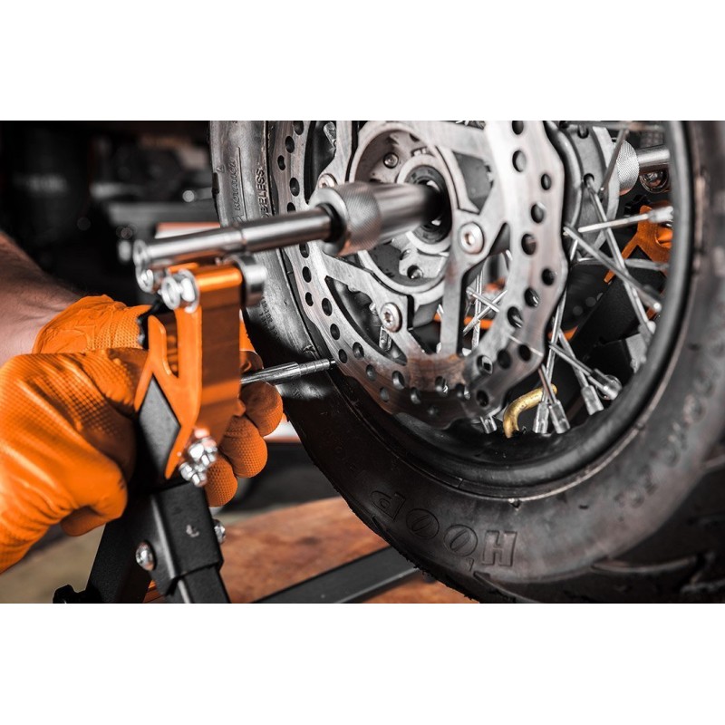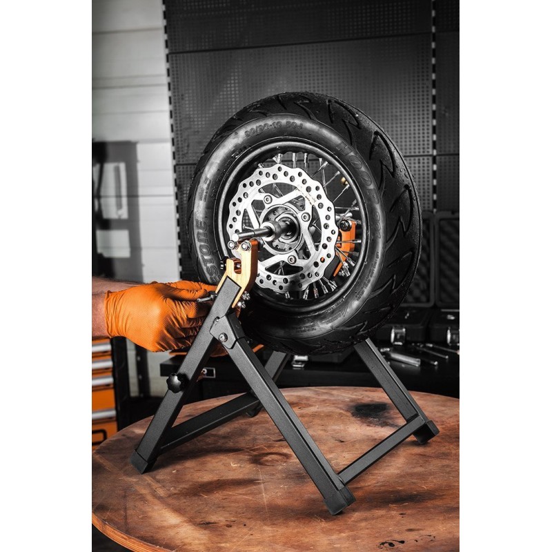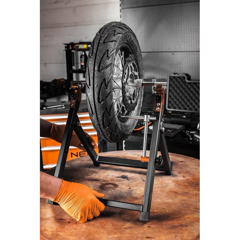 to przenośne i składane narzędzie o wadze zaledwie 3,9 kg. Precyzyjny przyrząd służy do wyważania statycznego koła w motocyklach. Wykonany został ze stali i oferuje możliwość pracy z kołem o maksymalnej średnicy 21” oraz zakresem średnicy osi od 14 do 28 mm. Wyważarka marki NEO polecana jest do warsztatów oraz zakładów motoryzacyjnych.