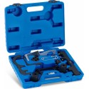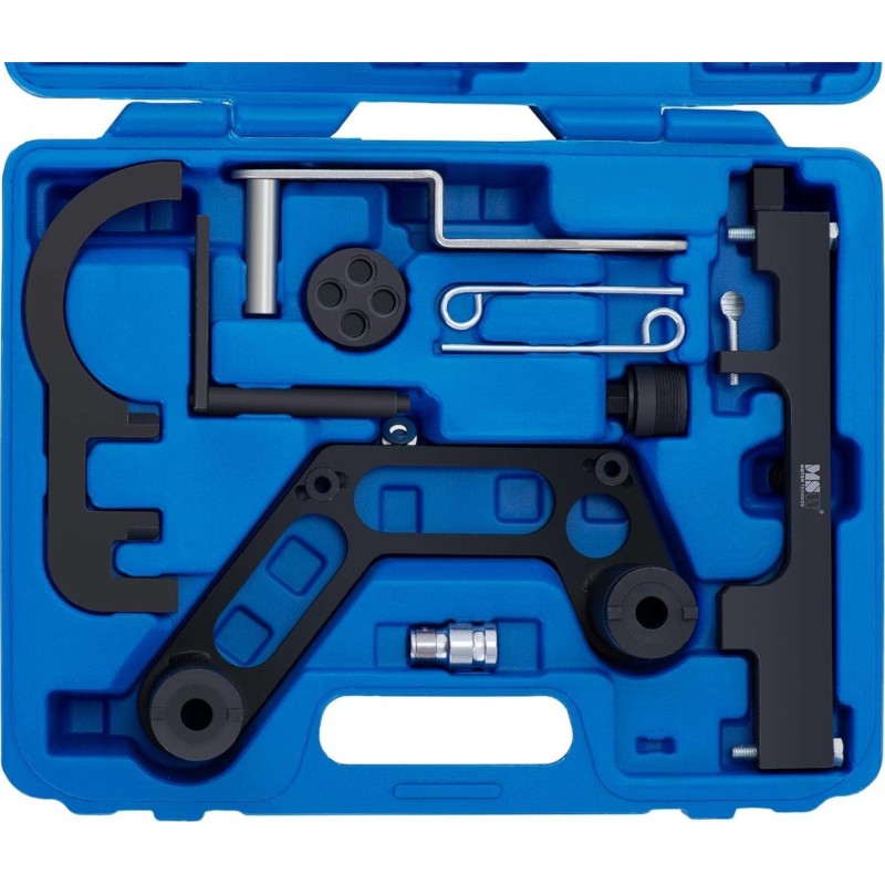 Blokada rozrządu firmy MSW pozwoli naprawić silnik samochodowy Diesla BMW i MINI z kodami N47 i N57. Dzięki niej można szybko wymienić i zablokować wałek rozrządu lub łańcuch rozrządu, wymienić uszczelkę głowicy cylindrów lub przeprowadzić inne naprawy. Narzędzia są optymalnie dopasowane do odpowiednich elementów silnika i dlatego są łatwe w użyciu. Blokada rozrządu gwarantuje najskuteczniejszą metodę mocowania i regulacji silnika. Zestaw MSW zużywa się w bardzo małym stopniu. W zestawie znajdują się narzędzia do regulacji wałków rozrządu, wałów korbowych, blokadę napięcia łańcucha rozrządu i inne. Wykonane zostały z wytrzymałej stali węglowej. Zapewnią więc wieloletnie użytkowanie. Kiedy urządzenie nie jest używane, można schować wszystkie przybory w wytrzymałej plastikowej walizce transportowej.