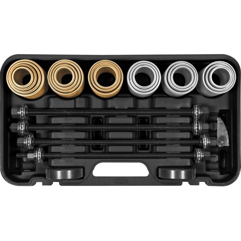 Zestaw składa się z 26 elementów, które umożliwiają kompleksową obsługę łożysk i tulei. W jego skład wchodzą różnorodne rozmiary śrub oraz tulei przelotowych, co czyni go niezwykle uniwersalnym narzędziem.