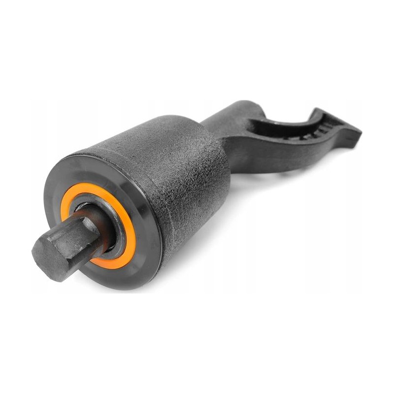Zamontuj korbę oraz nasadkę i przyłóż klucz do koła. Zablokuj stopkę oporową o najbliższą sąsiadującą śrubę - postępuj zgodnie z ruchem wskazówek zegara. Następnie przystąp do odkręcania za pomocą korby.