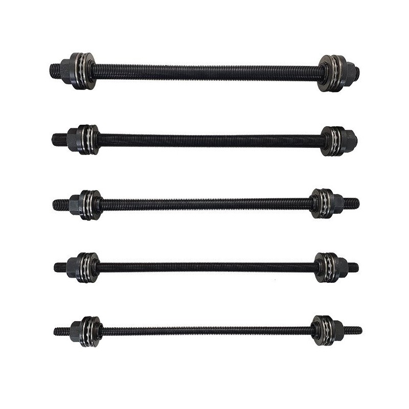 Zestaw zawiera pięć prasa śrubowych gwintowanych, które są wyposażone w łożyskowane końcówki. Dzięki długości 350 mm i różnym średnicom (M10, M12, M14, M16, M18), narzędzie to jest idealne do szerokiego zakresu zastosowań, co czyni je niezwykle wszechstronnym.