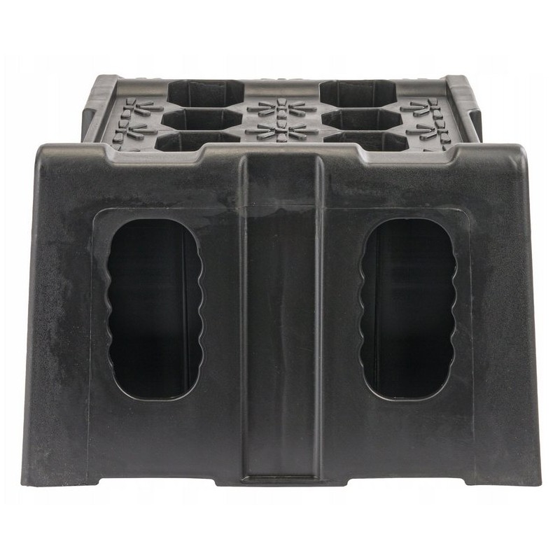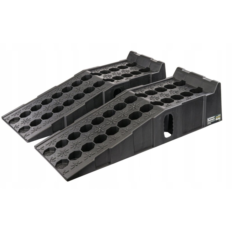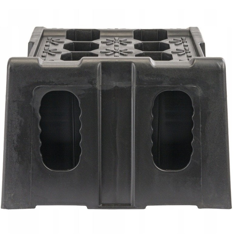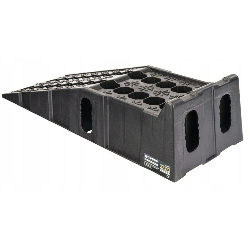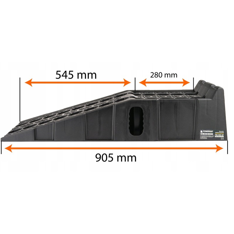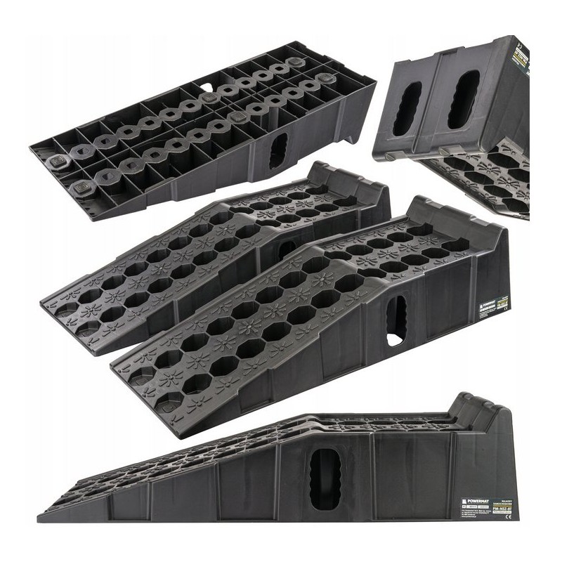 NAJAZDY SAMOCHODOWE | 2 SZT. | 8000 KG Marka: Powermat Model: PM-NZS-8T Dane techniczne Materiał wykonania: HDPE (polietylen wysokiej gęstości) Maksymalny udźwig: 8 T Wysokość: 180 mm Długość: 905 mm Szerokość: 265 mm Waga netto: 9,4 kg Najazdy charakteryzują się stabilną i wytrzymałą nieodkształcającą i nie pękającą konstrukcją, sporą długością i szerokością pasującą do większości aut osobowych, łagodnym kątem najazdu oraz gumowymi podkładkami, które w przeciwieństwie do innych produktów na rynku występują w większej ilości (aż sześciu), co zapewnia bezpieczny najazd kołami na platformy bez przesuwania ich kołami. Wysoki ogranicznik nie pozwoli na przypadkowe zjechanie z końca najazdu Uniwersalność Zastosowań: Najazdy samochodowe z HDPE (high density polyethylene) są wszechstronne, idealne do stosowania w różnych miejscach, takich jak parkingi, magazyny, czy strefy załadunkowe. Łatwa Instalacja i Przenoszenie: Lekkość materiału ułatwia transport, instalację oraz ewentualne przenoszenie najazdów, co jest korzystne w przypadku zmieniających się potrzeb logistycznych. Antypoślizgowość i Bezpieczeństwo: Dzięki specjalnej powierzchni, najazdy zapewniają skuteczną przyczepność opon samochodowych, co podnosi poziom bezpieczeństwa podczas manewrów. Odporność na Czynniki Atmosferyczne: Najazdy z HDPE są odporne na warunki atmosferyczne, co sprawia, że są trwałe i nie ulegają korozji, co jest istotne zwłaszcza na zewnątrz. Łatwość Utrzymania Czystości: Materiał jest łatwy do czyszczenia, co minimalizuje czas i koszty związane z utrzymaniem najazdów w czystości, co jest istotne w obszarach o wysokim ruchu pojazdów. Niskie Koszty Utrzymania: Najazdy wymagają minimalnej konserwacji, co przekłada się na niższe koszty eksploatacji w dłuższej perspektywie czasowej. Zrównoważone Materiały: HDPE, używane do produkcji najazdów, jest materiałem ogromnie wytrzymałym i przyjaznym dla środowiska, co sprawia, że korzystanie z tych rozwiązań wspiera zrównoważone praktyki. Gumy antypoślizgowe 6 gum antypoślizgowych umieszczonych pod najazdami samochodowymi pełni kluczową rolę w zabezpieczaniu przed poślizgiem, zapewniając dodatkową przyczepność do nawierzchni. Ta innowacyjna konstrukcja zwiększa bezpieczeństwo operacji logistycznych, eliminując ryzyko utraty kontroli nad pojazdem, zwłaszcza w trudnych warunkach atmosferycznych.