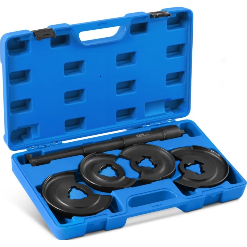Ściągacz do sprężyn marki MSW stanowi idealne narzędzie dla mechaników i amatorów motoryzacji. Pozwoli on wygodnie zdemontować oraz zamontować sprężyny amortyzatorów bez konieczności zdejmowana osi. Model MSW-HCSC-02 przeznaczono do samochodów Mercedes-Benz. Zestaw zawiera 4 płyty montażowe. Dwie mają rozmiar 90/150 mm, a dwie pozostałe – 70/130 mm. Ściągacz dostarczany jest z teleskopowym kompresorem o długości 325 mm. Został wykonany ze stali węglowej, dzięki czemu jest odporny na zużycie. Wszystkie elementy zestawu można przechować w poręcznej walizce.