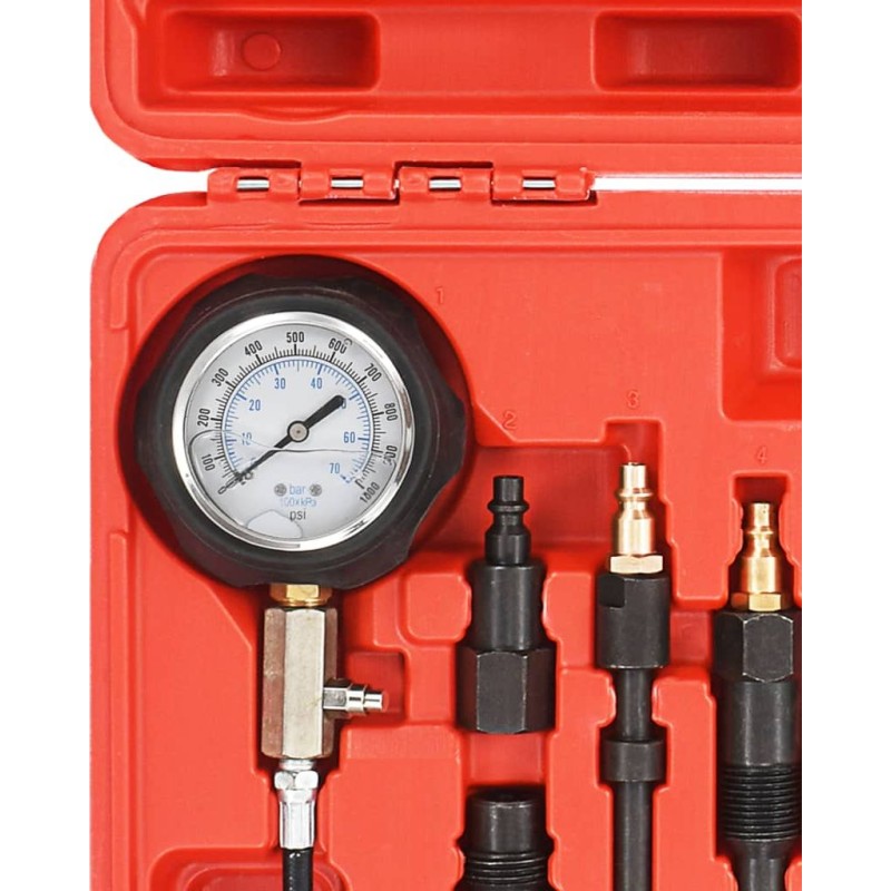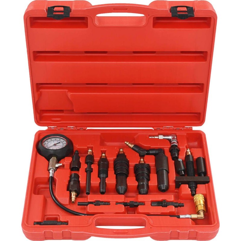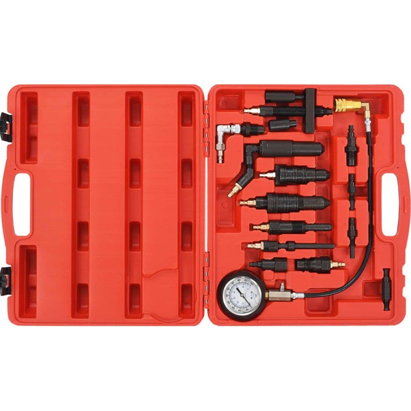 Ten łatwy w obsłudze zestaw do mierzenia ciśnienia sprężania w silniku diesla zawiera wszystkie niezbędne elementy, które pozwolą przetestować sprężanie w większości samochodów, ciężarówek i traktorów z silnikiem typu diesel.