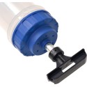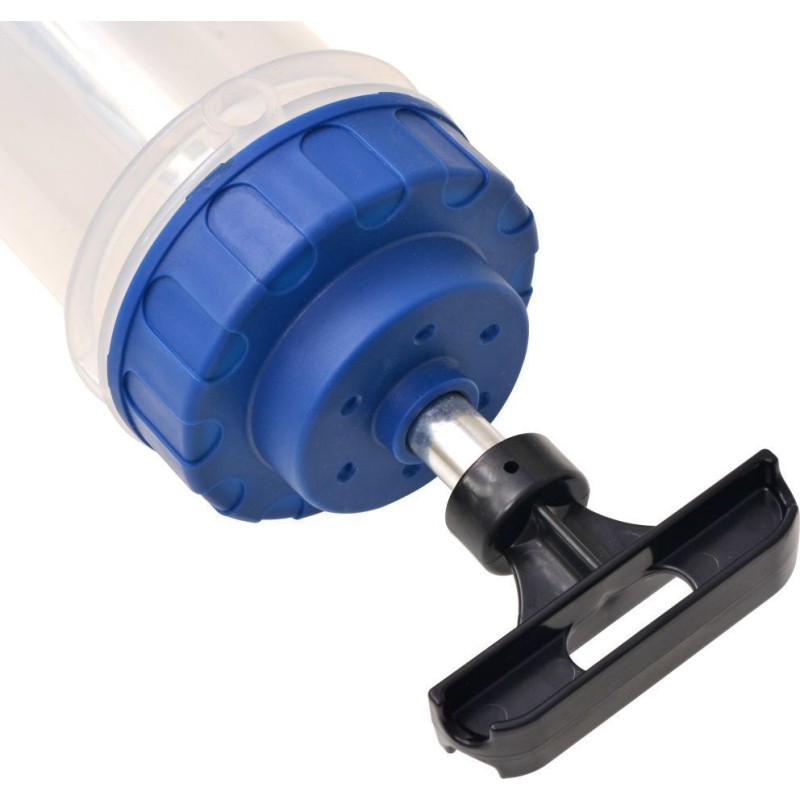 Pompa ssąca została wykonana z wysokiej jakości materiałów. Jest doskonale szczelna, dzięki czemu zapobiega rozlewaniu paliwa. Dzięki przeźroczystej obudowie strzykawki możesz sprawdzić kondycję wysysanych płynów. Odporna na ślizganie stopka zapobiega toczeniu się pojemnika, dodatkowo wokół strzykawki zamontowano antypoślizgowy pierścień.