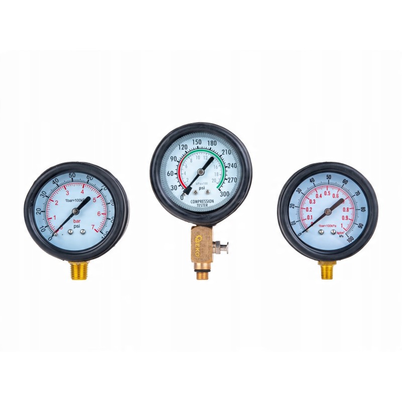 Zestaw zawiera manometry o różnych zakresach, co umożliwia pomiar ciśnienia w szerokim zakresie. Obejmuje to niskie ciśnienie (0–1 bar), standardowe wartości w układach paliwowych (0–7 bar) oraz wysokie ciśnienia w testach kompresji (0–20 kPa). Dzięki temu tester jest wszechstronny i dostosowany do różnych typów silników motocyklowych.