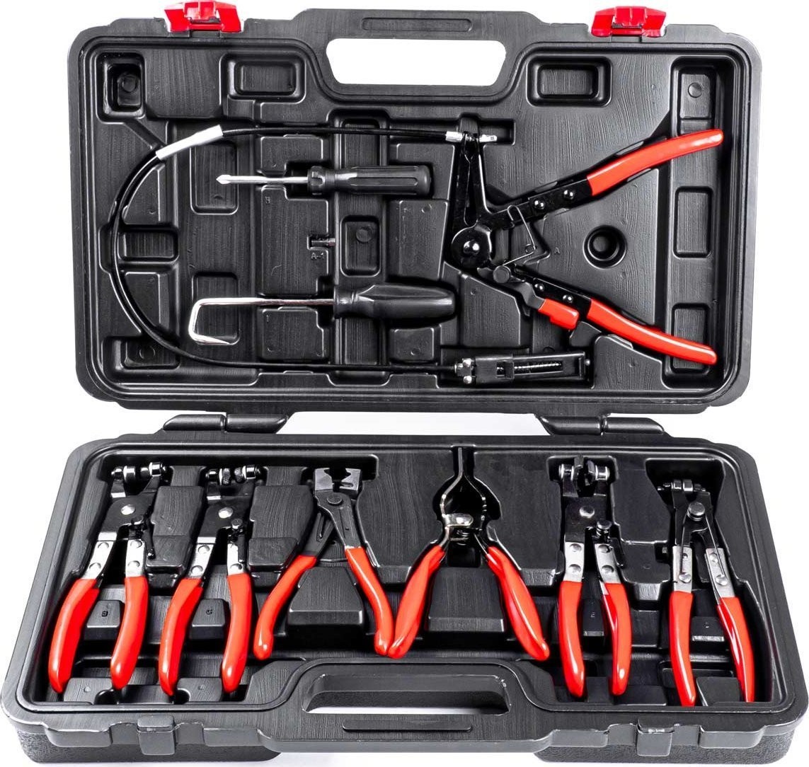 Zestaw szczypiec do opasek zaciskowych, który gwarantuje komfort pracy w serwisie samochodowym czy domowym warsztacie. Wszystkie elementy wykonano z wysokiej jakości materiałów. Szczypce z obrotowymi szczękami pasują do większości rodzajów sprężystych opasek zaciskowych, obrotowe szczęki ponacinane w celu dobrego trzymania dużych i małych zacisków pod dowolnym kątem. Blokada zapadkowa umożliwiająca przytrzymanie szczęk w 5 różnych pozycjach. Blokada pozwala na bezpieczne trzymanie naprężonej opaski. Szczypce do opasek zaciskowych z linką pozwalają zdejmować opaski zaciskowe i blokować ją w pozycji otwartej. Precyzyjny zacisk na końcu giętkiej linki umożliwia dojście do trudno dostępnych miejsc. Umożliwiają zdejmowanie plastikowych i metalowych samozaciskowych opasek w zakresie od 18-54 mm. Jak poprzednie te również posiadają blokadę opasek. Zestaw zawiera: 1 - Szczypce do opasek zaciskowych z linką 2 - Szczypce do opasek z obrotowymi szczękami 3 - Szczypce do opasek z obrotowymi ponacinanymi szczękami 4 - Specjalnie wyprofilowany, odgięty szpikulec 5 - Szczypce do opasek typu CLIC oraz CLIC-R: 6 - Szczypce do wąskich opasek zaciskowych. 7 - Wkrętak uniwersalny krzyżowy + płaski 8 - Ściągacz do giętkich przewodów: 9 - Wygięte szczypce do wąskich opasek zaciskowych: Niezbędne podczas prac z przewodami i wężami w silnikach samochodowych. Większość z nich zamocowana jest przy użyciu opasek zaciskowych oraz klamer. Szczypce ułatwiają demontaż. Wykonane zostały z najwyższej jakości materiałów Odporne na uderzenia czy obicie Rękojeści pokryte ergonomicznym anty poślizgowym materiałem Pozwalają na wygodną pracę w ciasno zabudowanej komorze silnikowej