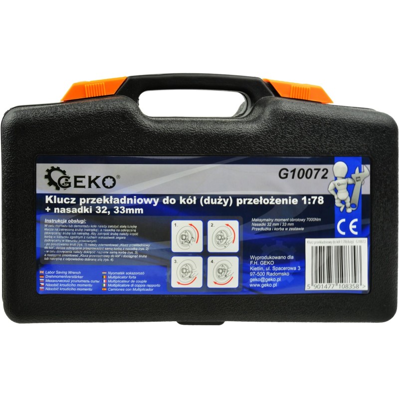 Klucz przekładniowy do kół 1:78(duży) Klucz znajduje zastosowanie przy montażu/demontażu/odkręcaniu zapieczonych śrub. DANE TECHNICZNE : Maksymalny moment obrotowy 7000Nm Nasadki 32 mm i 33 mm Przedłużka i korba w zestawie