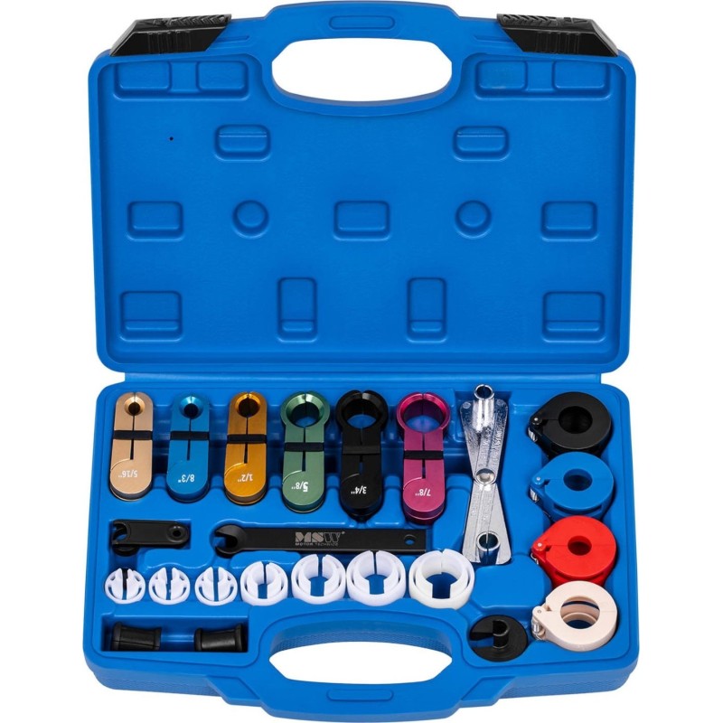 Zestaw do złącz paliwowych i klimatyzacji marki MSW zaprojektowano do użytku profesjonalnego w warsztatach i serwisach samochodowych. Zestaw złącz pasuje do szerokiej gamy pojazdów. Dzięki kodowaniu kolorami różnych rozmiarów obsługa przebiega błyskawicznie. Profesjonalny zestaw nadaje się do złącz przewodów paliwowych, klimatyzacji oraz chłodnicy skrzyni biegów. Narzędzie dostarczane jest w praktycznej walizce, która ułatwia transport i przechowywanie.