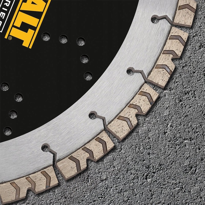 Tarcze diamentowe DeWALT ELITE SERIES zostały zaprojektowane z myślą o trwałości i wydajności cięcia twardych materiałów budowlanych (beton, beton zbrojony, kamień, granit). Dzięki zastosowaniu segmentów spawanych laserowo z większą ilością diamentów oraz mocniejszym spoiwem, tarcze te oferują aż 5-krotnie dłuższą żywotność cięcia twardych materiałów w porównaniu do tarcz dedykowanych do betonu C35. Opatentowana konstrukcja ostrza strzały umożliwia szybkie cięcie w twardym betonie oraz oferuje wysokiej jakości proste i głębokie cięcia. Wzmocniona węglikiem matryca zwiększa siłę wiązania diamentu, co przekłada się na jeszcze wyższą wydajność. Rdzeń tarczy wykonany ze stali wysokostopowej pozwala na proste i głębokie cięcia.