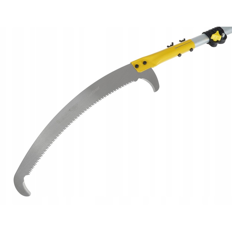 Trzonek piły wykonany z aluminium łączy lekkość z wytrzymałością, co sprawia, że narzędzie jest łatwe w obsłudze oraz transportowaniu. Dodatkowo, mechanizm blokady z 3-stopniowymi zaciskami motylkowymi zapewnia stabilność podczas pracy, co zwiększa bezpieczeństwo użytkowania.