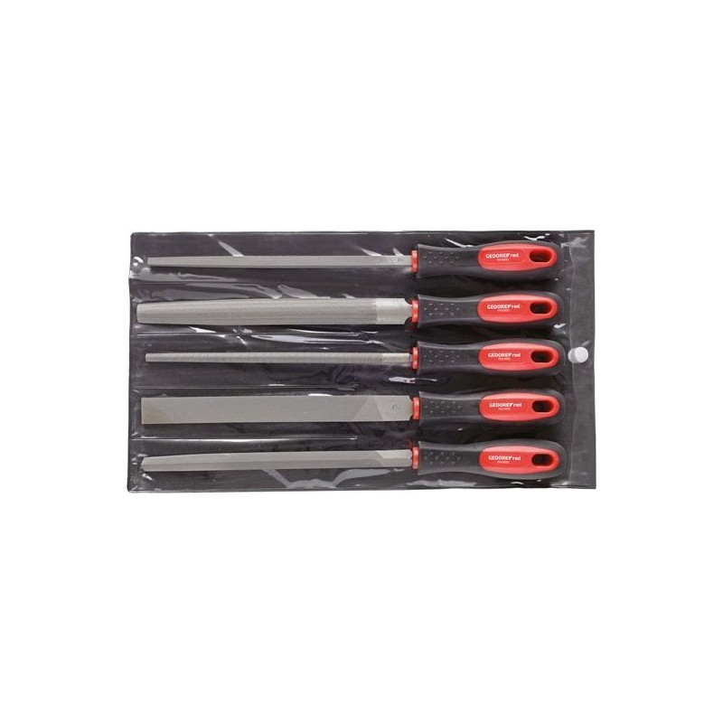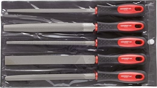- Nazwa typu elementu: Zestaw pilników GEDORE red, 5-częściowy, stal specjalna, torba z tworzywa sztucznego, uchwyt dwuskładnikowy, czerwono-czarny