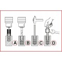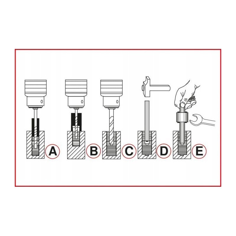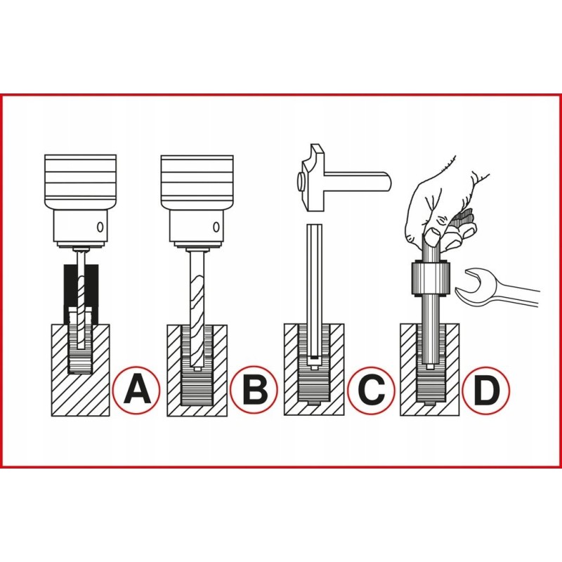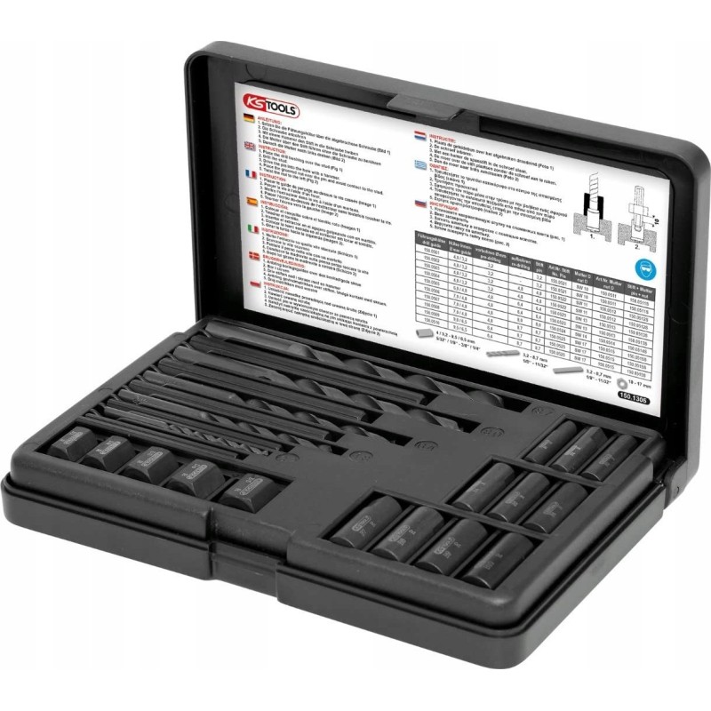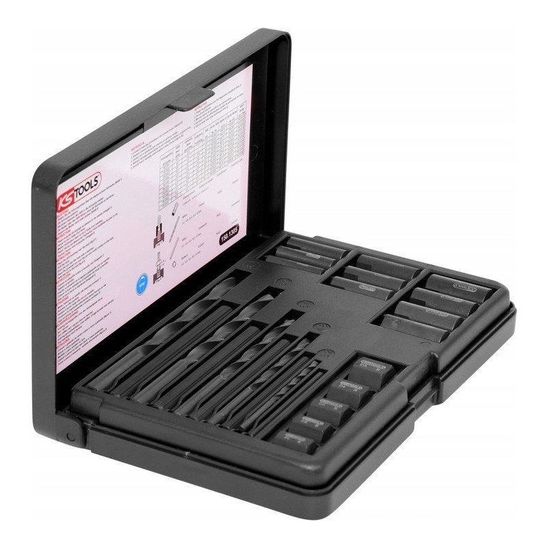 Wszechstronny zestaw do naprawy ułamanych śrub i szpilek. Nie uszkadza gwintów. Innowacyjny wykrętak z profilowanym końcem, pozwalający na łatwe rozszerzenie szpilek. Przeznaczony do śrub i bolców o rozmiarze M5-M16. Wykonany ze specjalnej stali narzędziowej. Pakowany w solidną i trwałą walizkę z tworzywa sztucznego.