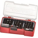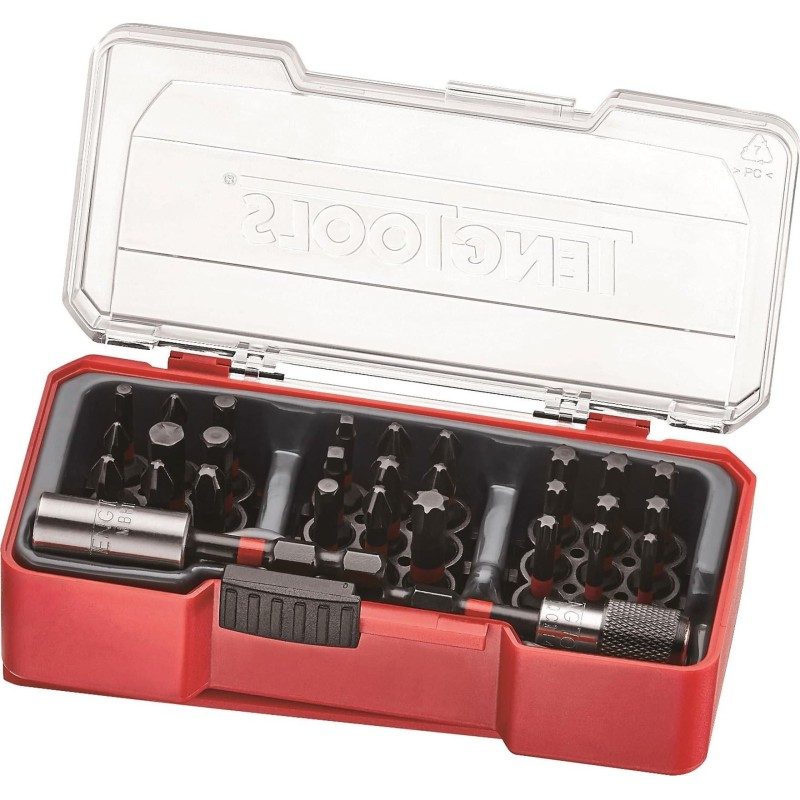 Zawiera oprawkę do grotów Impact z magnesem, oprawkę do grotów Impact z uchwytem szybkomocującym i 27 grotów wymiennych Impact 30 mm. Wszystkie groty z chwytem sześciokątnym 1/4". Specjalnie dostosowane do wkrętarek udarowych. Dostarczany w etui z tworzywa sztucznego, z przezroczystą pokrywką zatrzaskową, osadzoną na zawiasie z metalową ośką. Z uchwytem do mocowania na pasku. Pasuje do zasobnika TTTJ04, który z kolei pasuje do skrzynek i wózków narzędziowych Teng Tools.
