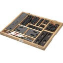 Skrzynka asortymentowa z zestawem narzędzi mocującychWykonanie: ze stali ulepszonej cieplnie. Walizki asortymentowe zawierają wszystkie elementy niezbędne do szybkiego mocowania narzędzi, przyrządów obróbkowych lub obrabianych detali na stołach z wpustami teowymi. Wszystkie elementy, które są zgodne z normami DIN lub normami zakładowymi są wymienne i mogą być uzupełniane w każdej chwili.Zdejmowana pokrywa pozwala na przechowywanie otwartej skrzynki w szafce narzędziowej. Zakres dostawy: drewniane pudełko z pastą do śrub.Dociski boczne są dostarczane z nakrętkami do wpustów teowych DIN 508, śrubami DIN 912 i dwoma kluczami imbusowymi DIN 911. Dociski boczne są dostarczane z nakrętkami do wpustów teowych DIN 508, śrubami DIN 912 i dwoma kluczami imbusowymi DIN 911....