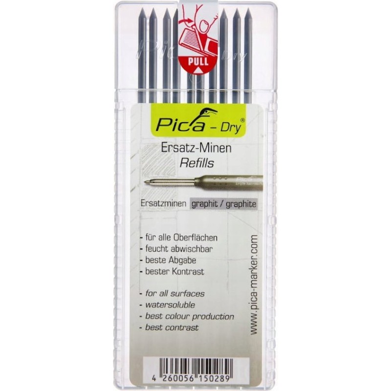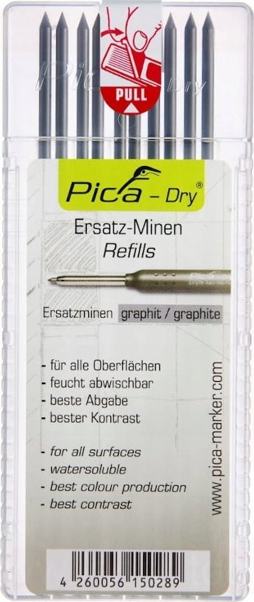Wkłady do ołówka Pica Dry nadają się do prawie każdej powierzchni, bez problemu możemy zaznaczać na suchych, błyszczących, szorstkich, zakurzonych, jasnych i ciemnych powierzchniach dzięki nim wyznaczone punkty i linie. Wkłady są od razu fabrycznie zaostrzone. Bez problemu w razie pomyłki z powierzchni można zetrzeć znakowanie za pomocą wilgotnej ściereczki. Zabezpieczone są w plastikowym opakowaniu.