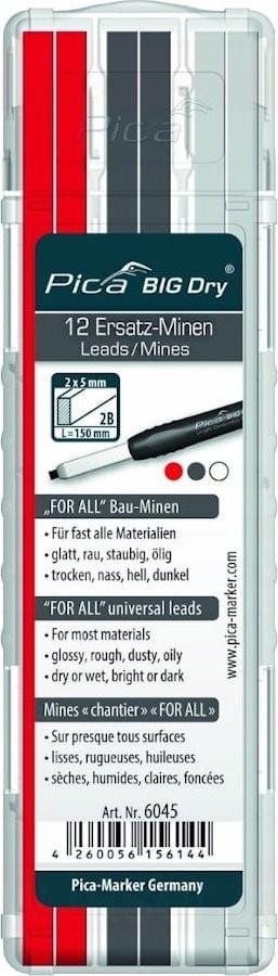 Wkłady do ołówka Pica Big Dry nadają się do prawie każdej powierzchni, bez problemu możemy zaznaczać na mokrych, suchych, błyszczących, szorstkich, zakurzonych, tłustych, jasnych i ciemnych powierzchniach dzięki nim wyznaczone punkty i linie. Wkłady są od razu fabrycznie zaostrzone. Bez problemu w razie pomyłki z gładkich powierzchni można zetrzeć znakowanie za pomocą wilgotnej ściereczki. Znaczenia wkładami są niewidoczne pod farbą dyspersyjną. Zabezpieczone są w plastikowym opakowaniu, które otwiera się obustronnie.