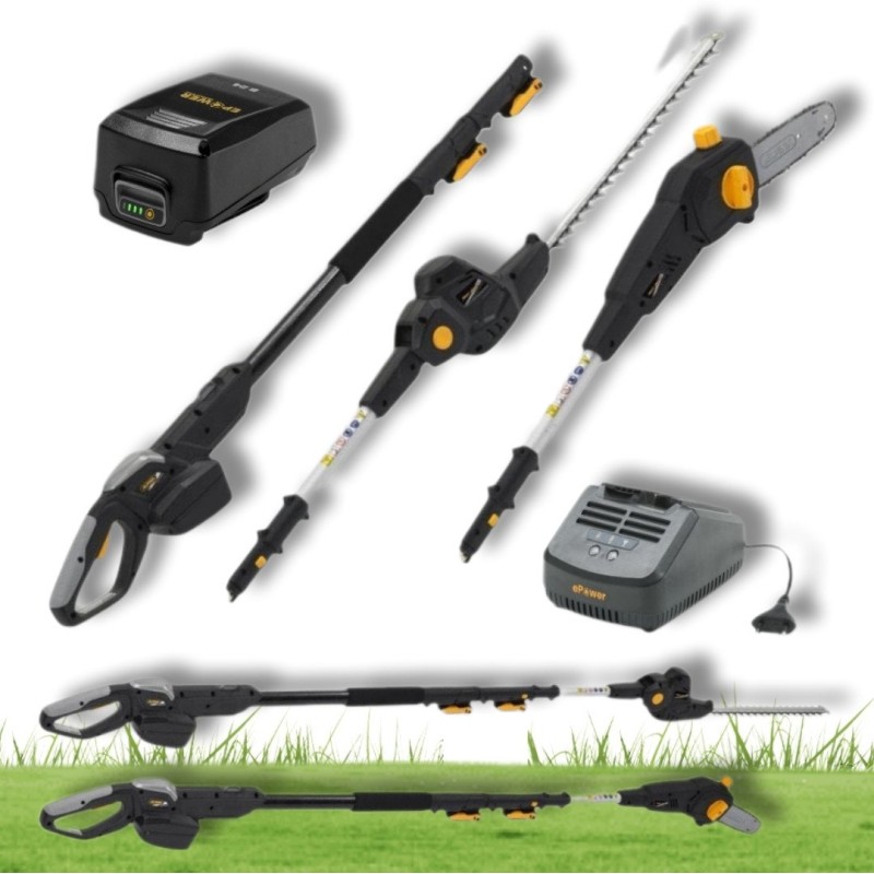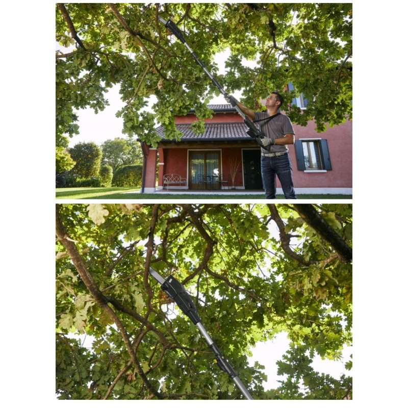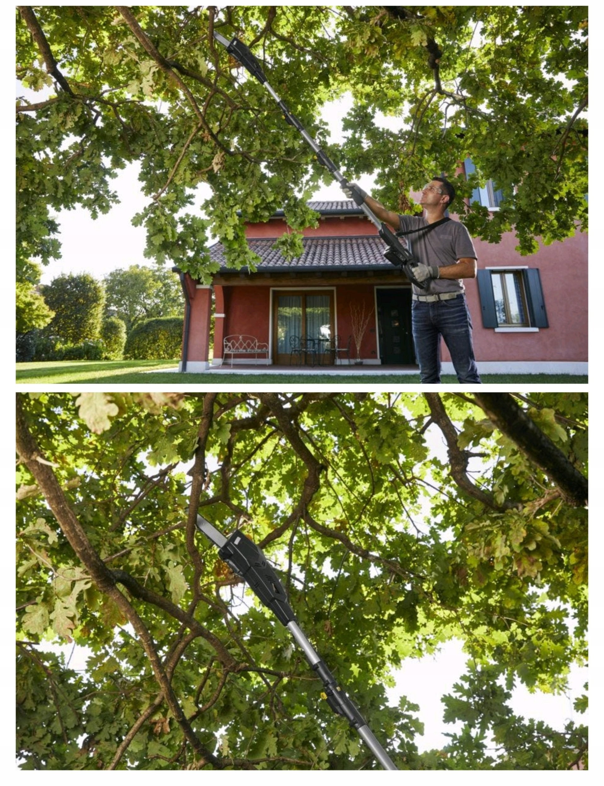 Wbudowany teleskopowy wałek umożliwia osiągnięcie maksymalnego zasięgu do 4 metrów, co sprawia, że prace na wysokości są teraz prostsze i bezpieczniejsze. Użytkownik może komfortowo przycinać gałęzie bez konieczności wspinania się na drabinę.