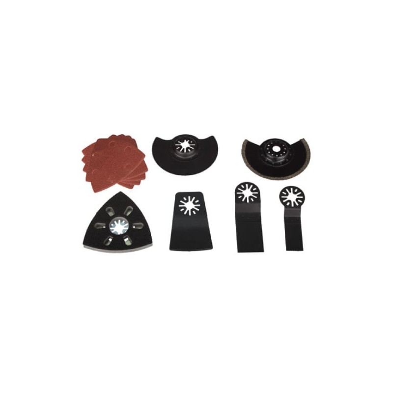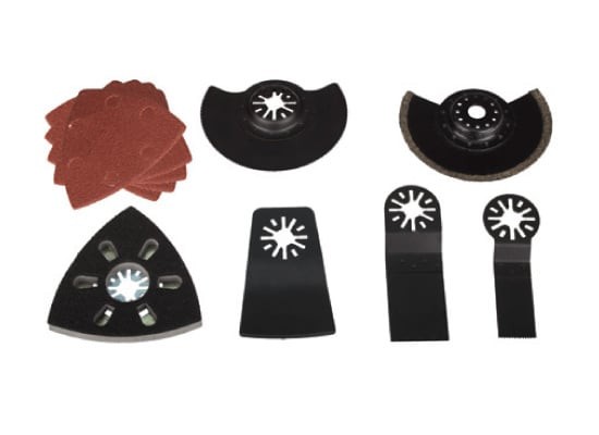 - Końcówki robocze - 6szt (stopa szlifierska, brzeszczot z nasypem do ceramiki, skrobak, brzeszczot półokrągły do drewna i tworzyw, bezeszczot wgłębny szeroki, brzeszczot wgłębny wąski) - widoczne na zdjęciu nr 2