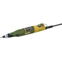 Do wiercenia, szlifowania, polerowania, czyszczenia, wycinania i grawerowania. Niespotykanie smukła obudowa ze wzmocnionego włóknem szklanym poliamidu z miękkimi wstawkami w obrębie uchwytu umożliwia operowanie urządzeniem przy pomocy dwóch palców (chwyt długopisowy). PROXXON MICROMOT 230/E posiada dobrze wyważony, cichy silnik na prąd stały o długiej żywotności. Maksymalna prędkość obrotów 20 000 obr/min może być płynnie zredukowana do 6 000 obr/min. Urządzenie posiada praktycznie ten sam moment obrotowy w niższym zakresie obrotów. Jest to szczególnie istotne przy precyzyjnym wierceniu, czyszczeniu czy też polerowaniu. Trzpień obraca się w łożysku kulkowym. Maszyna jest wyposażona w wysokiej jakości zaciski narzędziowe. Nawet najmniejsze wiertła, frezy itp. są bardzo pewnie trzymane, przez co wyeliminowane zostały jakiekolwiek „bicia”. Zarówno zakładanie jak i zdejmowanie osprzętu odbywa się poprzez naciśnięcie przycisku znajdującego się w okolicach uchwytu. W zestawie znajduje się sześć zacisków narzędziowych (1 – 1,5 – 2 – 2,4 – 3 i 3,2 mm).